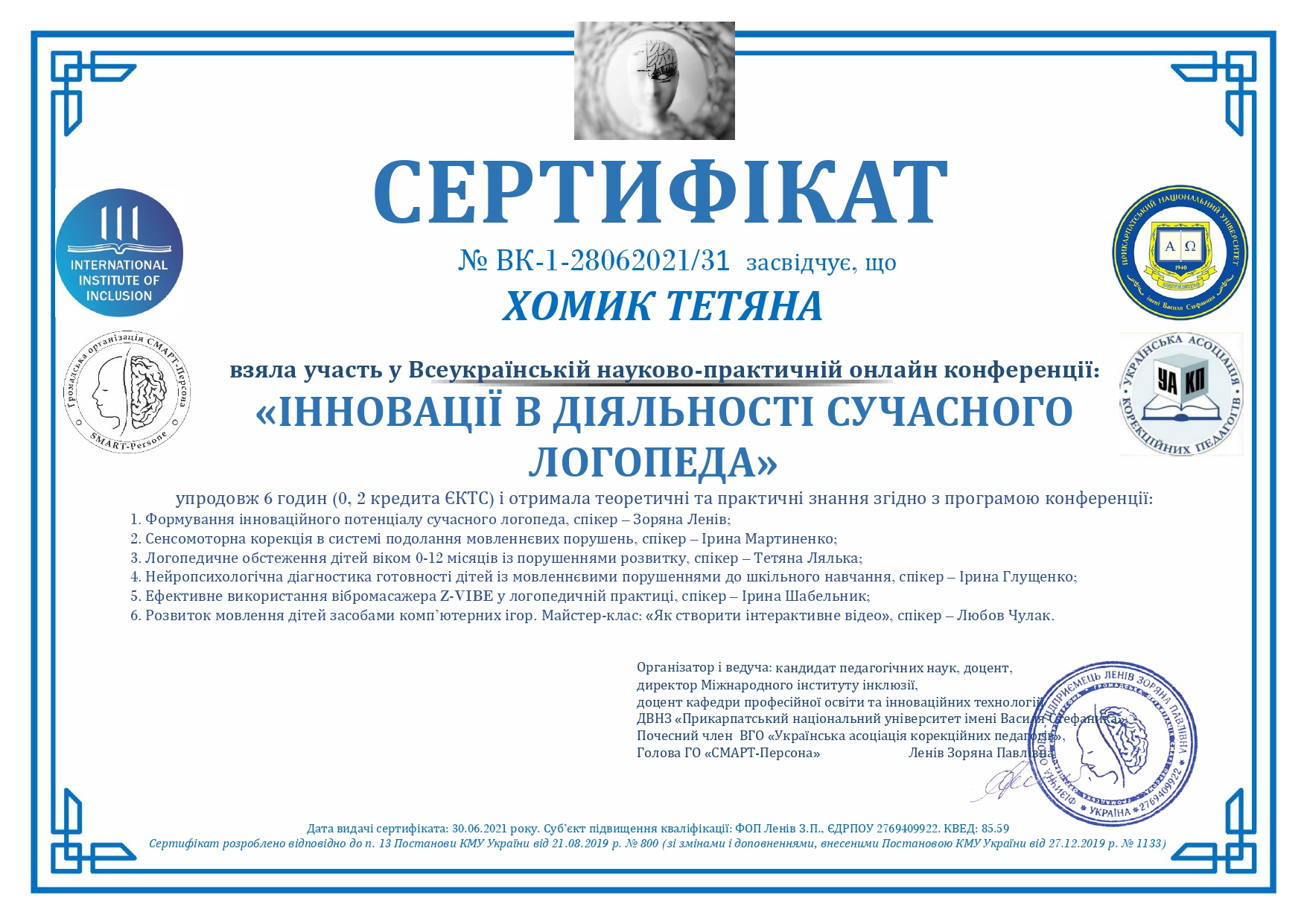 | 8234 | Вчителі 2.0: онлайн-курс із професійного розвитку та наставництва | Інший модуль | certificate_Хомик_ТВ_compressed.pdf | 28.06.2023 00:00 |