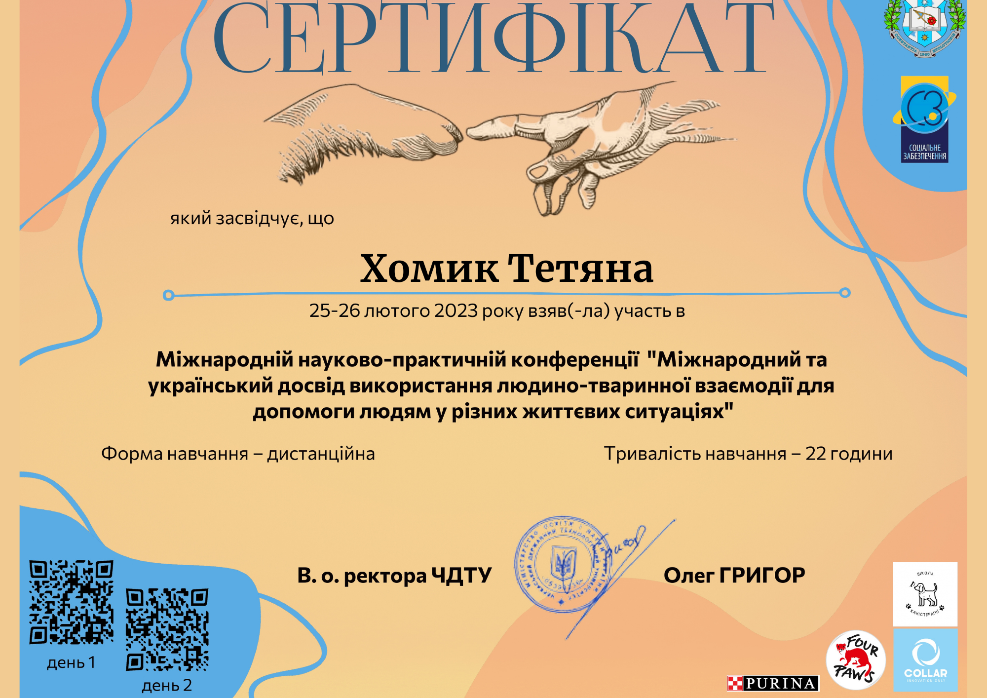 | 9415 | Міжнародний та український досвід використання людино-тваринної взаємодії для допомоги людям у різних життєвих ситуаціях | --- | Черкаси, Україна |