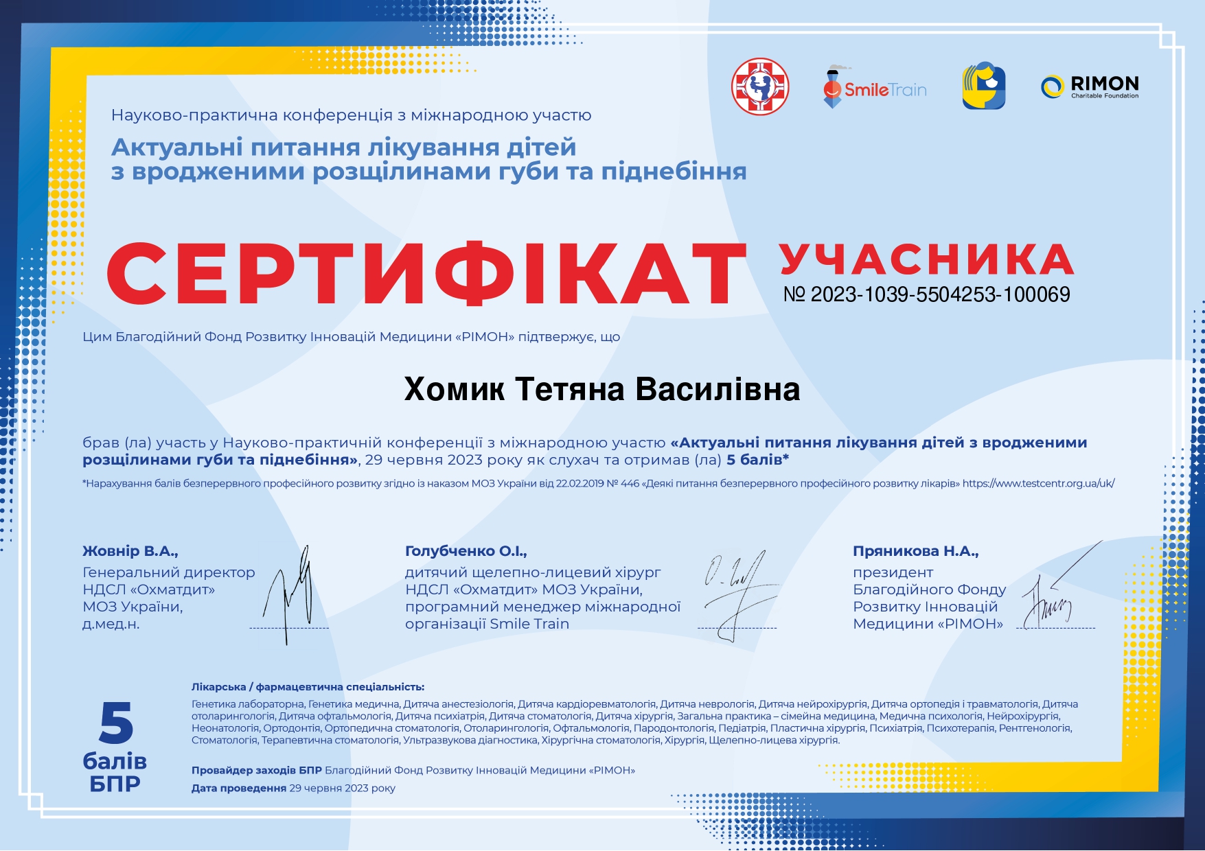 | 9436 | Науково-практична конференція з міжнародною участю "Актуальні питання лікування дітей з вродженими розщілинами губи та піднебіння" | --- | Київ, Україна |
