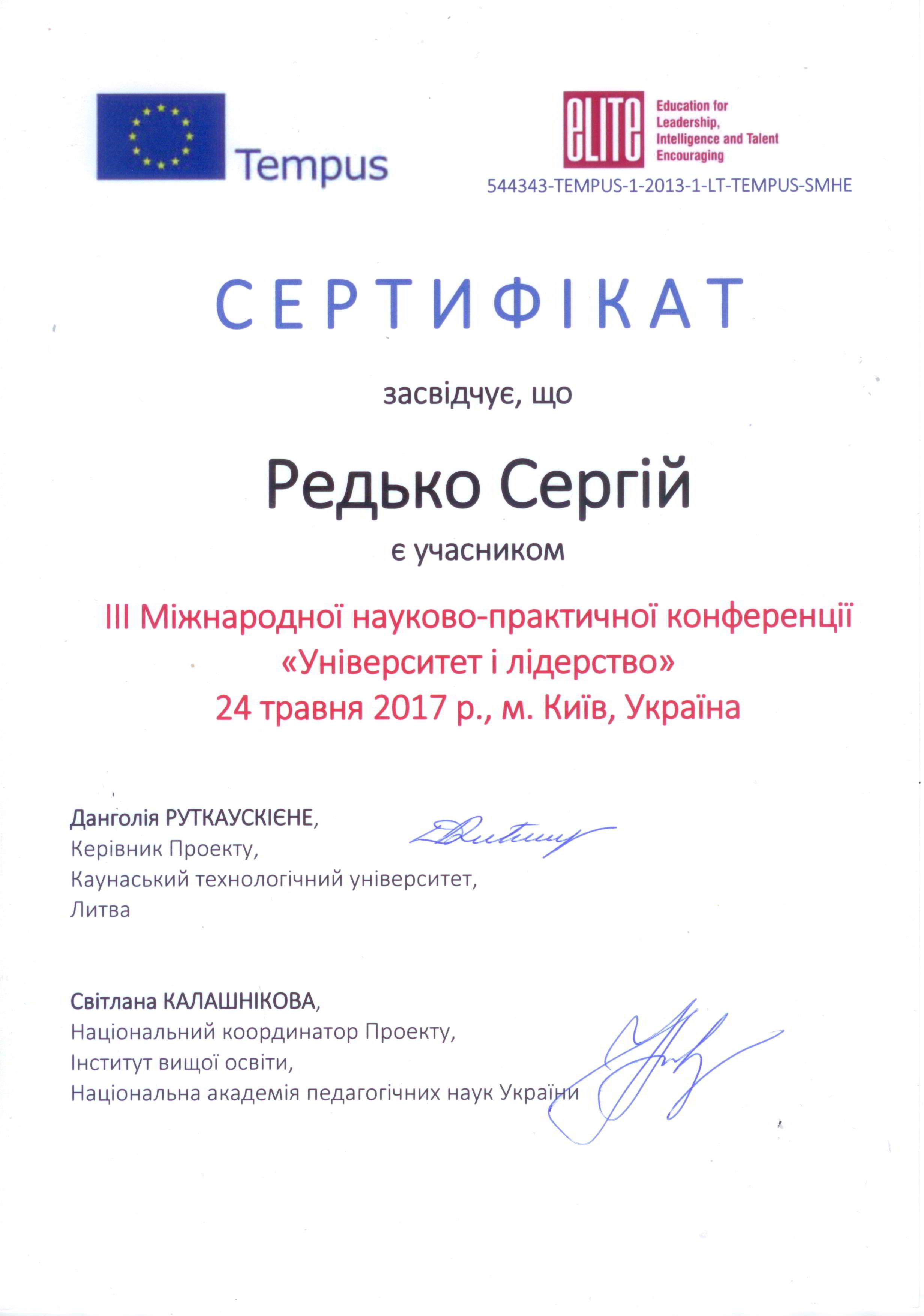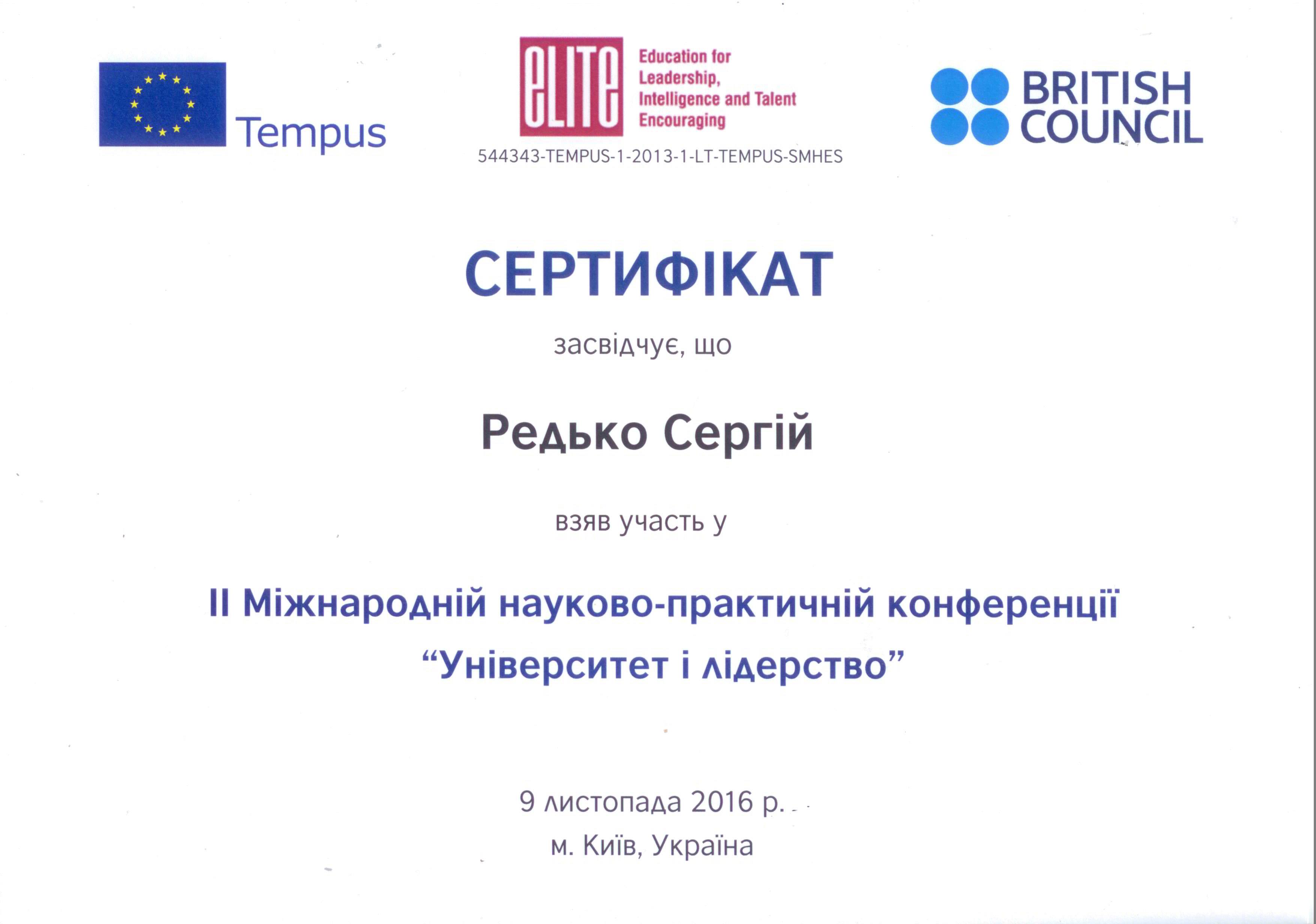 | 10 | TEMPUS | 544091-TEMPUS-1-2013-1-BE-TEMPUS-JPCR | Європейська Комісія | ELITE Education for Leadership, Intelligence and Talent Encouraging | 1 грудня 2013 – 1 липня 2017 р | Учасник проекту |