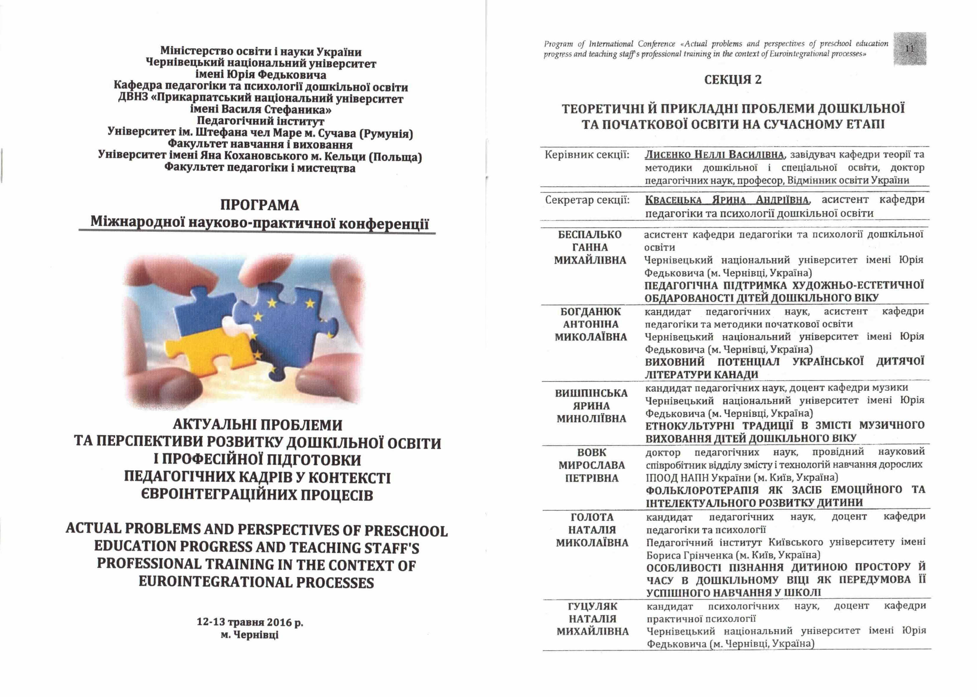 | 152 | Міжнародна науково-практична конференція 'Актуальні проблеми та перспективи розвитку дошкільної освіти і професійної підготовки педагогічних кадрів у контексті євроінтеграційних процесів' | Особливості пізнання дитиною простору й часу в дошкільному віці як передумова її успішного навчання у школі | м. Чернівці |