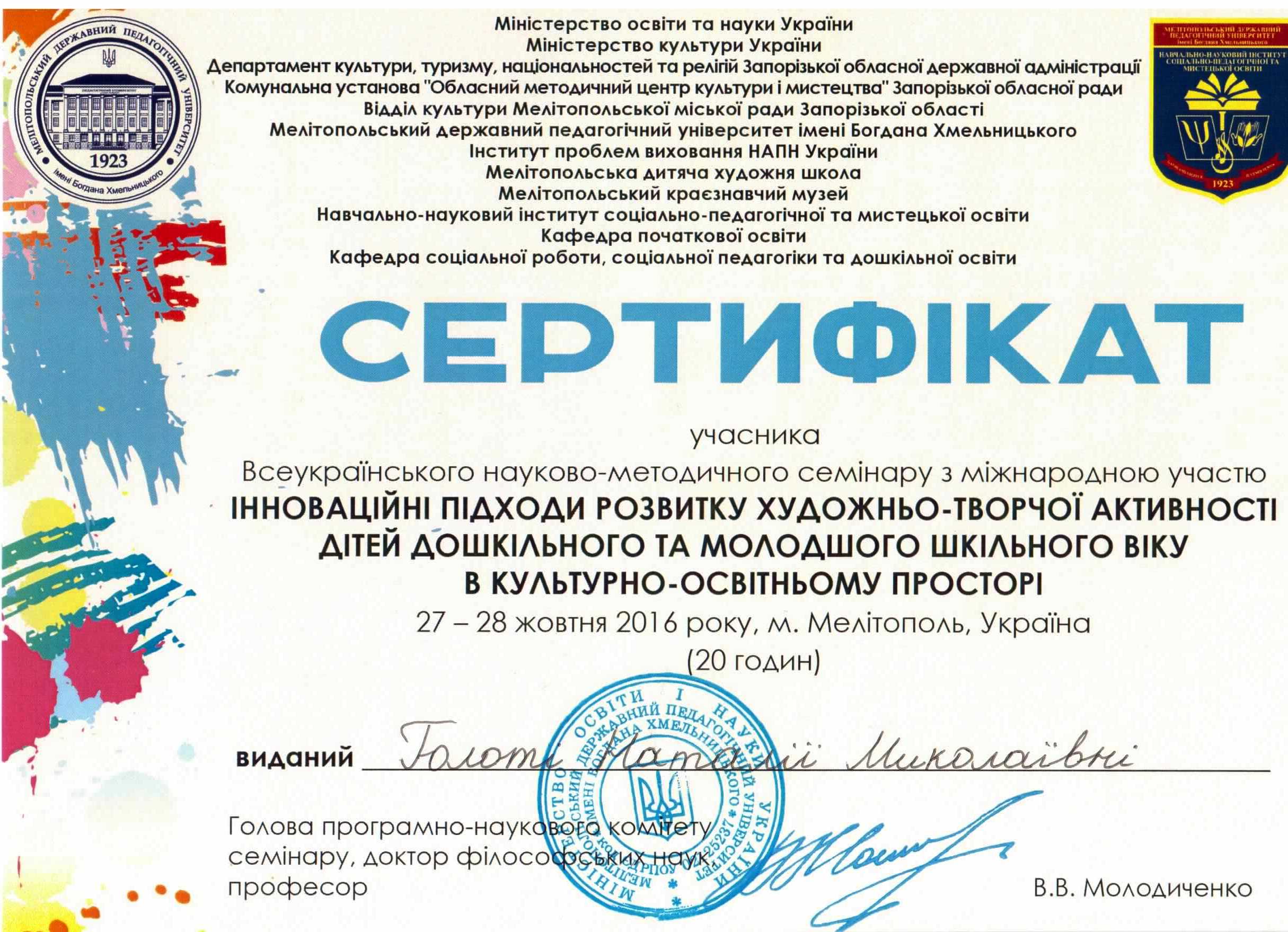 | 153 | Всеукраїнський науково-методичний семінар з міжнародною участю 'Інноваційні підходи розвитку художньо-творчої активності дітей дошкільного та молодшого шкільного віку в культурно-освітньому просторі' | Художньо-пізнавальна активність дітей старшого дошкільного віку в процесі ознайомлення з часом і простором | м.Мелітополь, Україна |