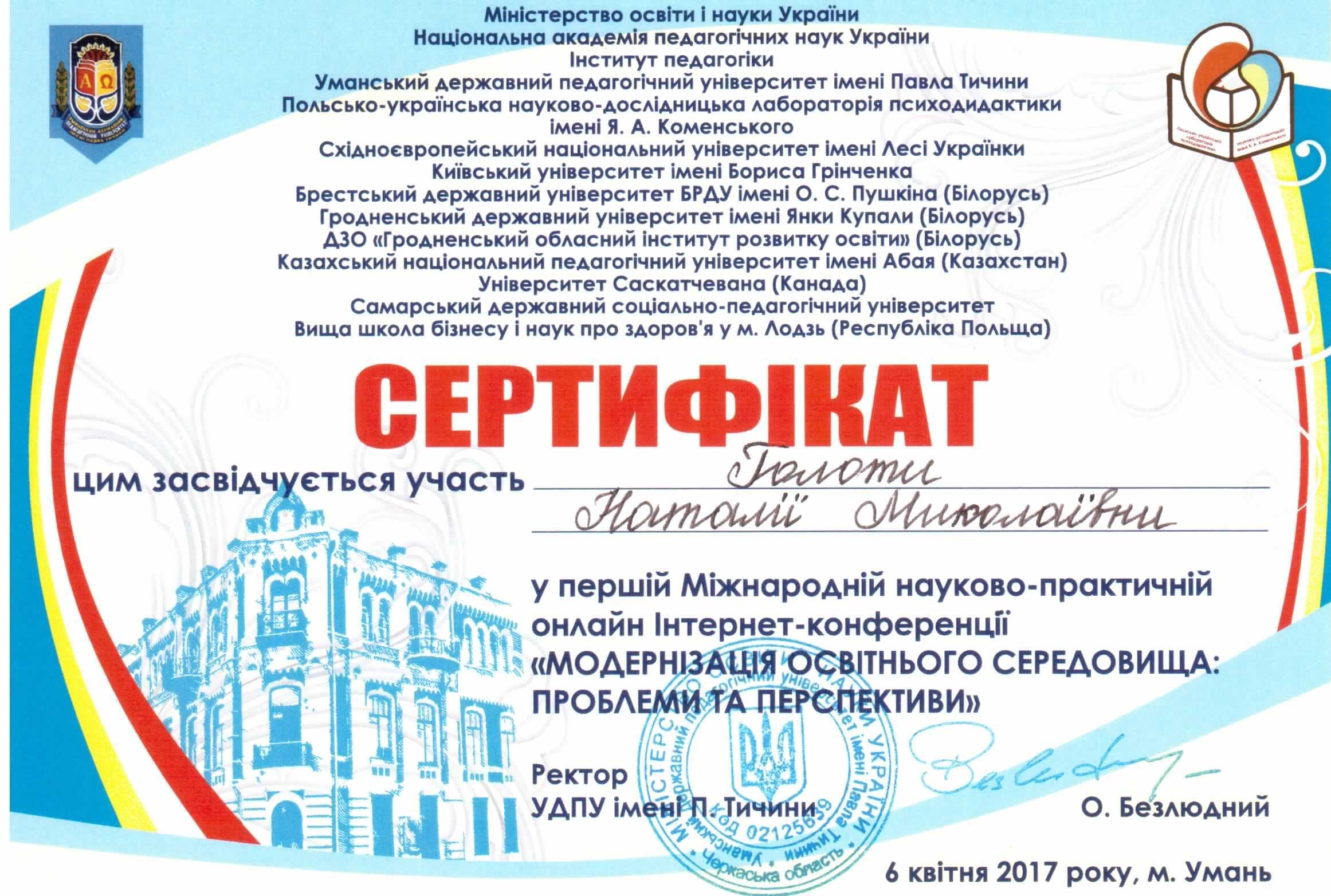 | 2029 | ! Міжнародна інтернет-конференція "Модернізація освітнього середовища: проблеми та перспективи" | Особливості підготовки вихователів до формування просторово-часових уявлень дітей дошкільного віку | Умань |