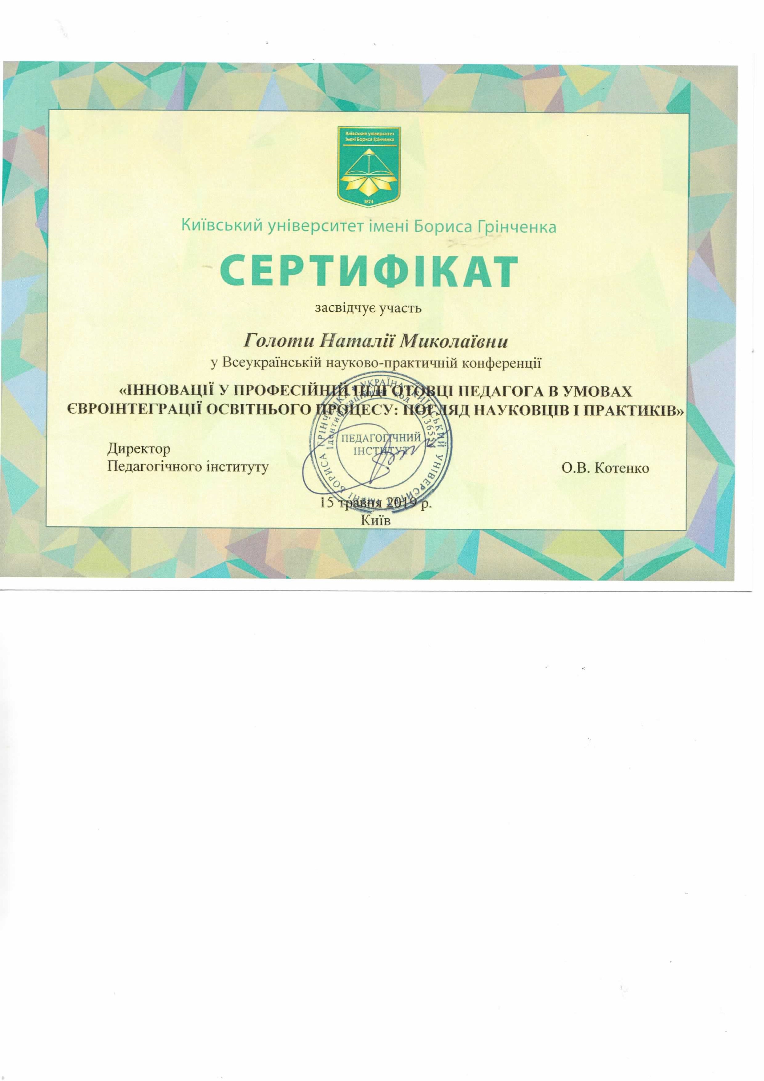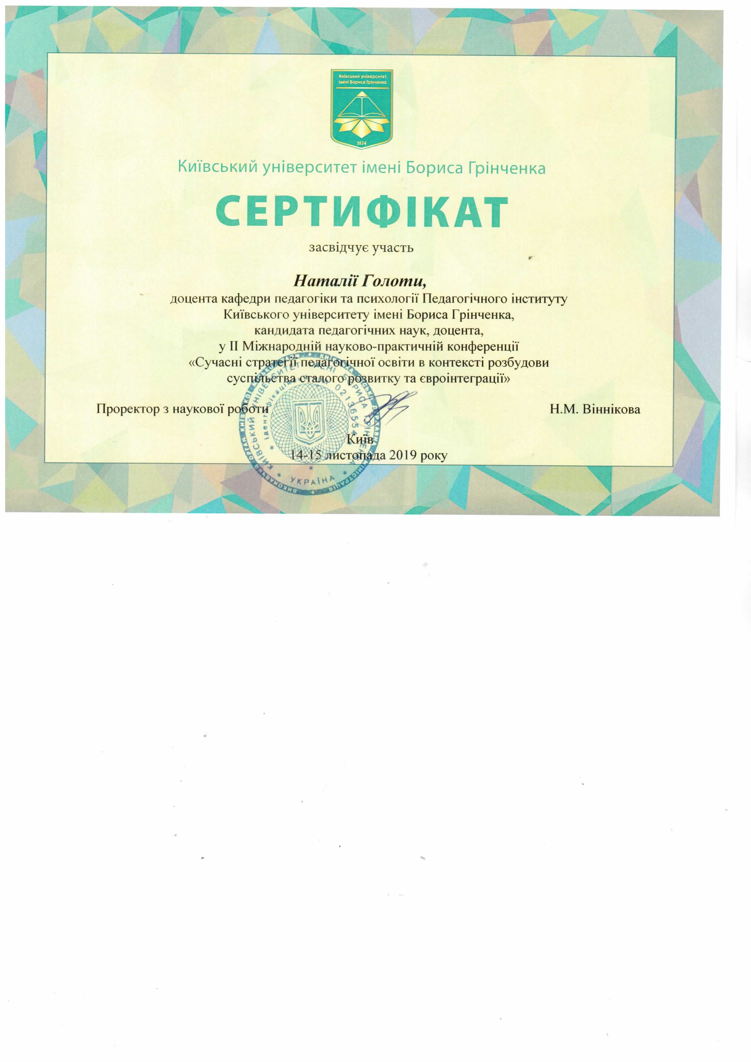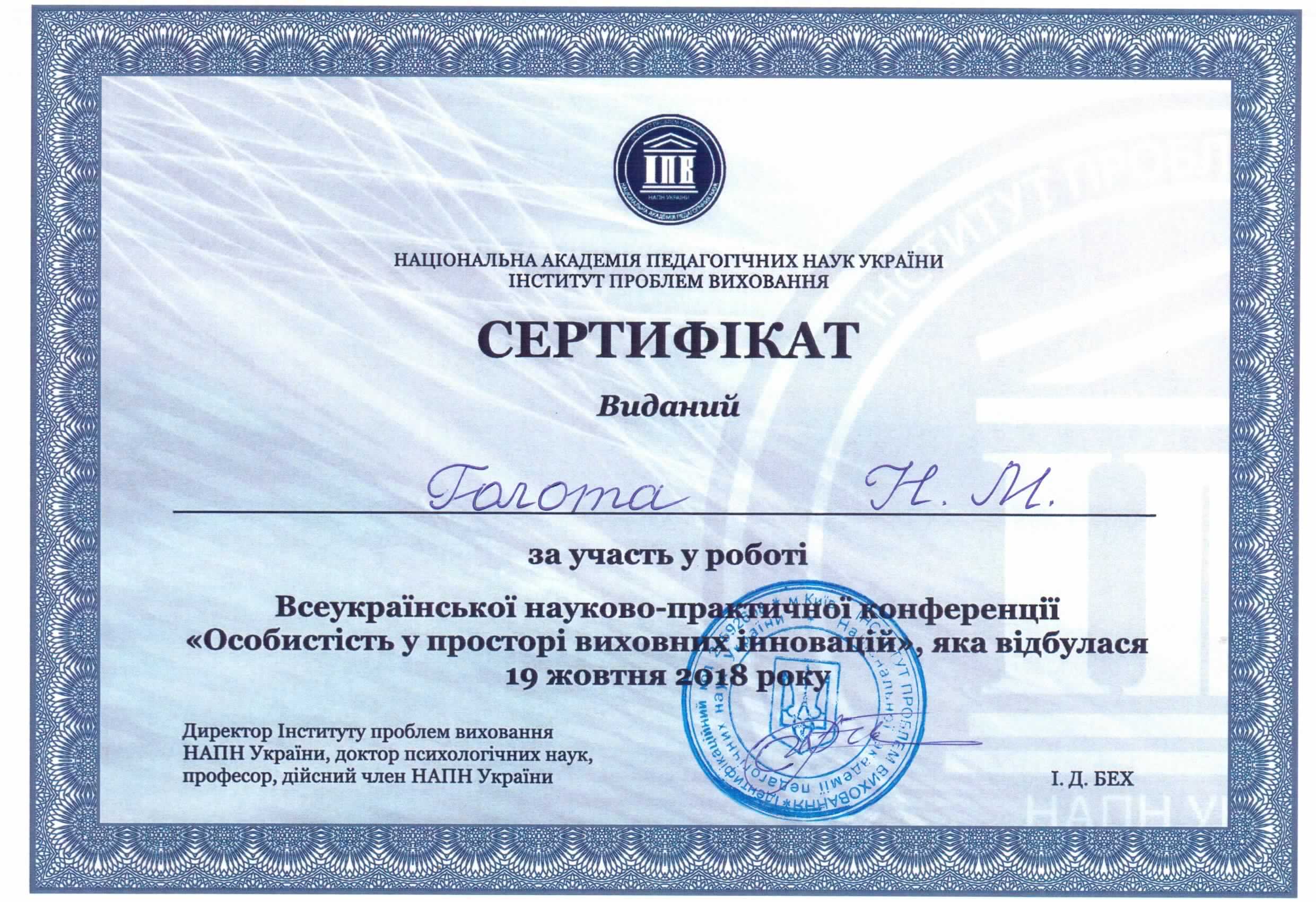 | 3701 | Всеукраїнська науково-практична конференція "Особистість у просторі виховних інновацій" | Учасник | Інститут проблем виховання НАПН України, м.Київ |