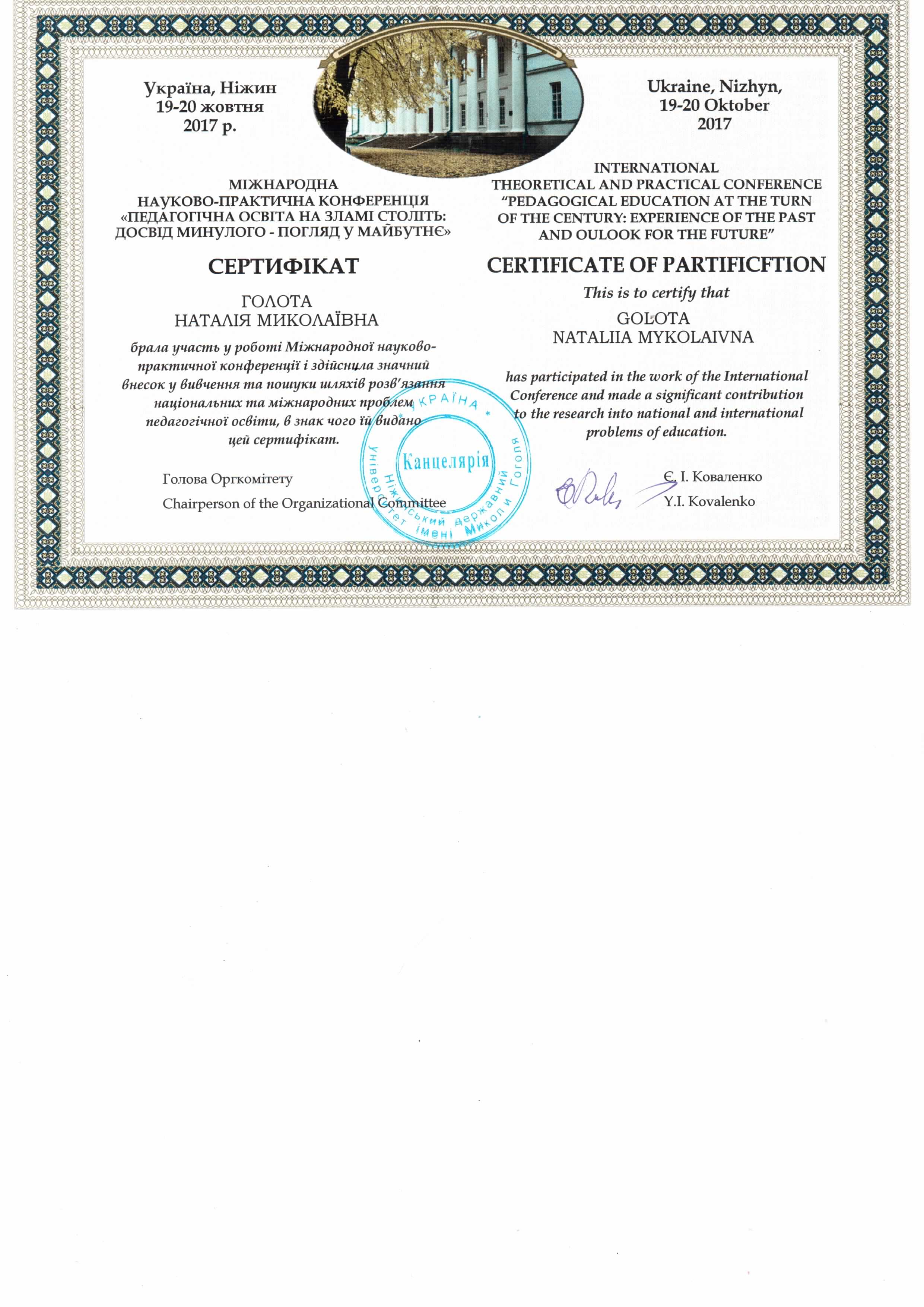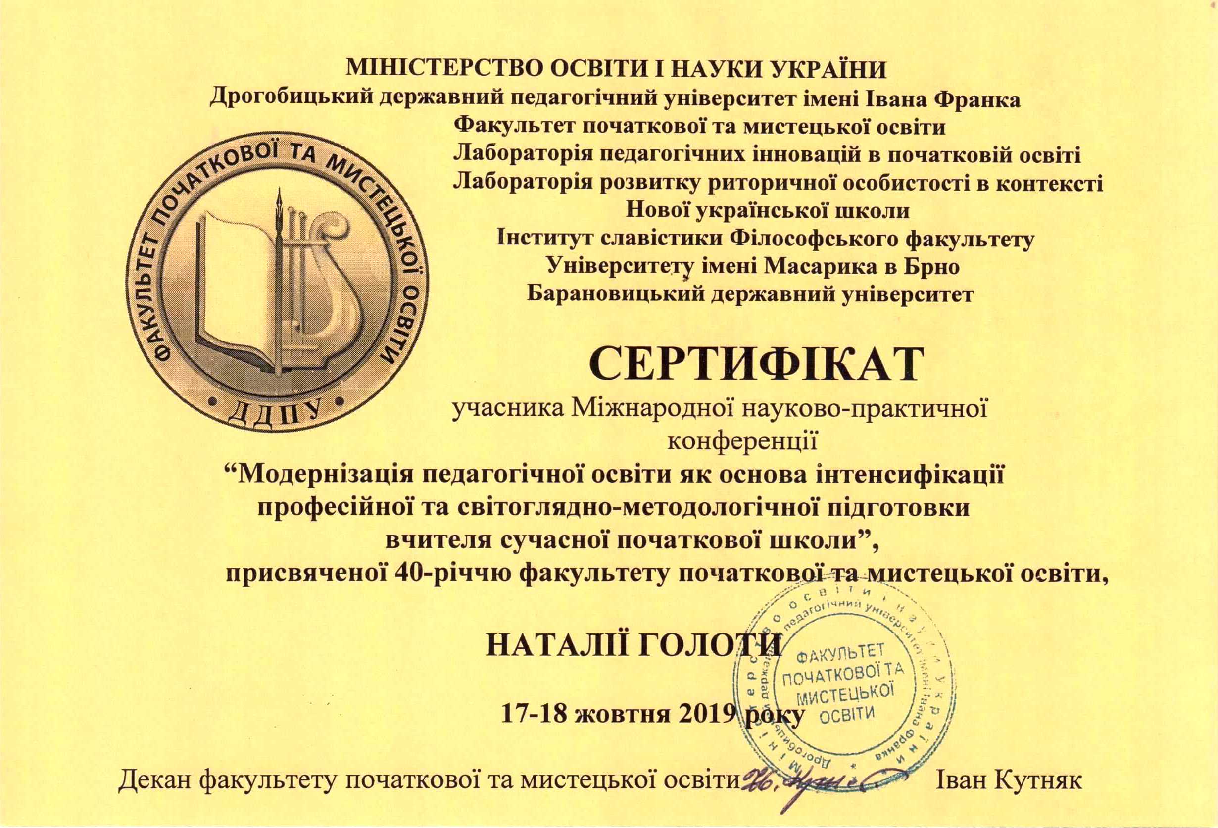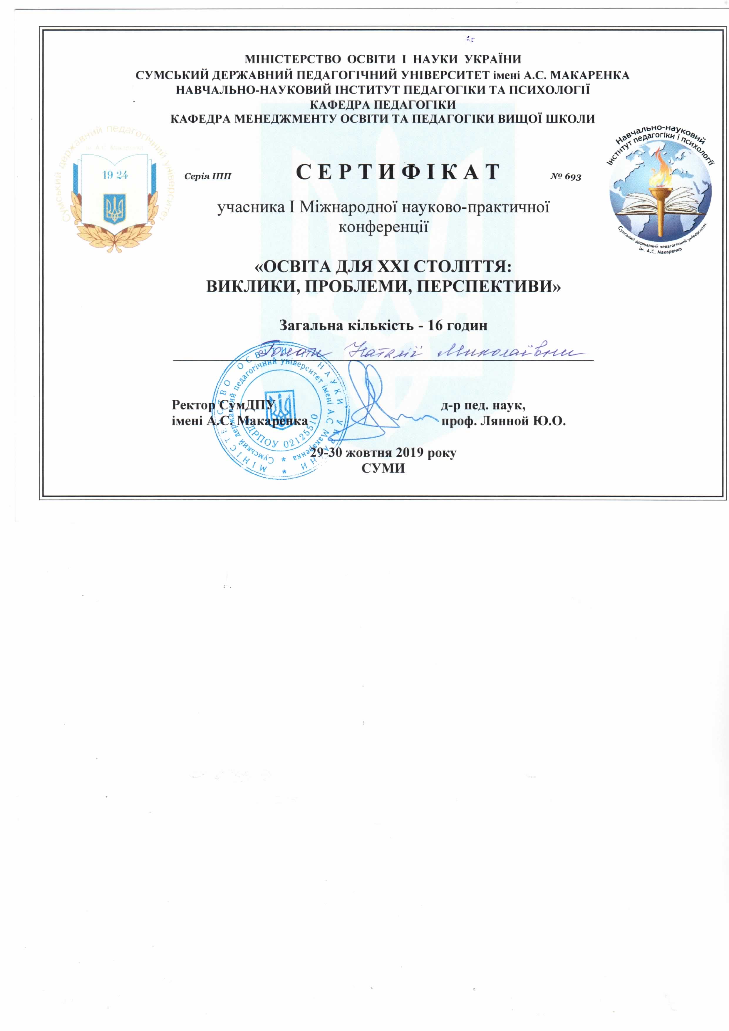 | 3701 | Всеукраїнська науково-практична конференція "Особистість у просторі виховних інновацій" | Учасник | Інститут проблем виховання НАПН України, м.Київ |