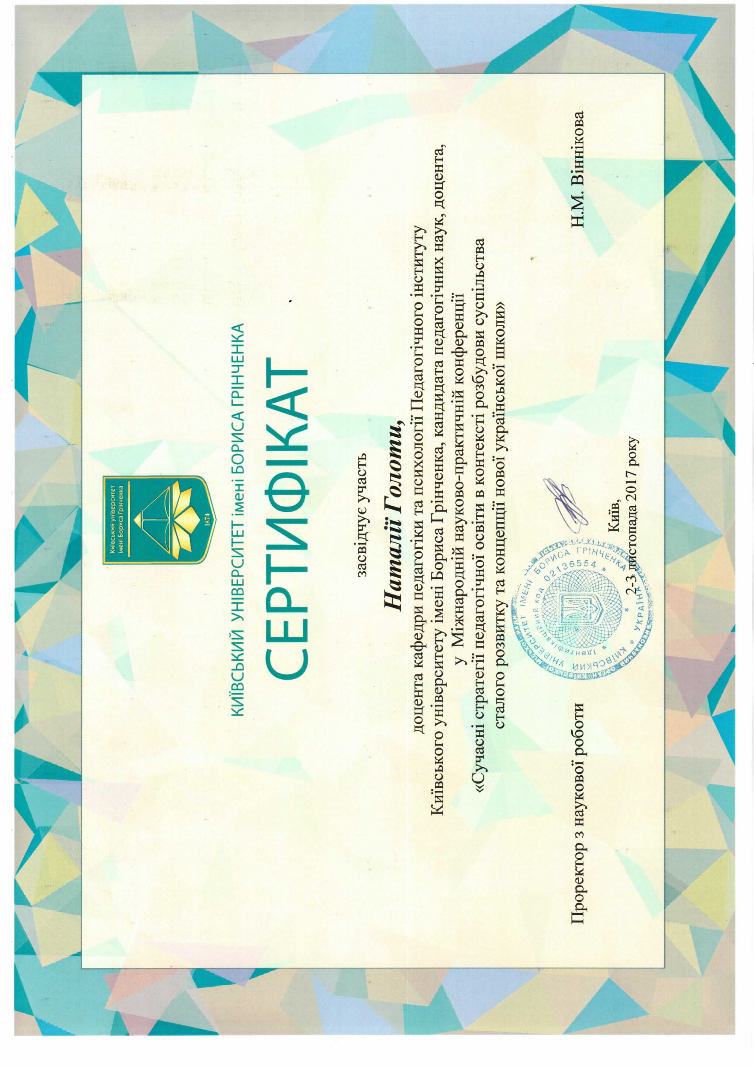 | 1246 | «Сучасні стратегії педагогічної освіти в контексті розбудови суспільства сталого розвитку та концепції Нової української школи | Міжнародна науково-практична конференція | Київський університет імені Бориса Грінченка | 02.11.2017 00:00 | 10 |