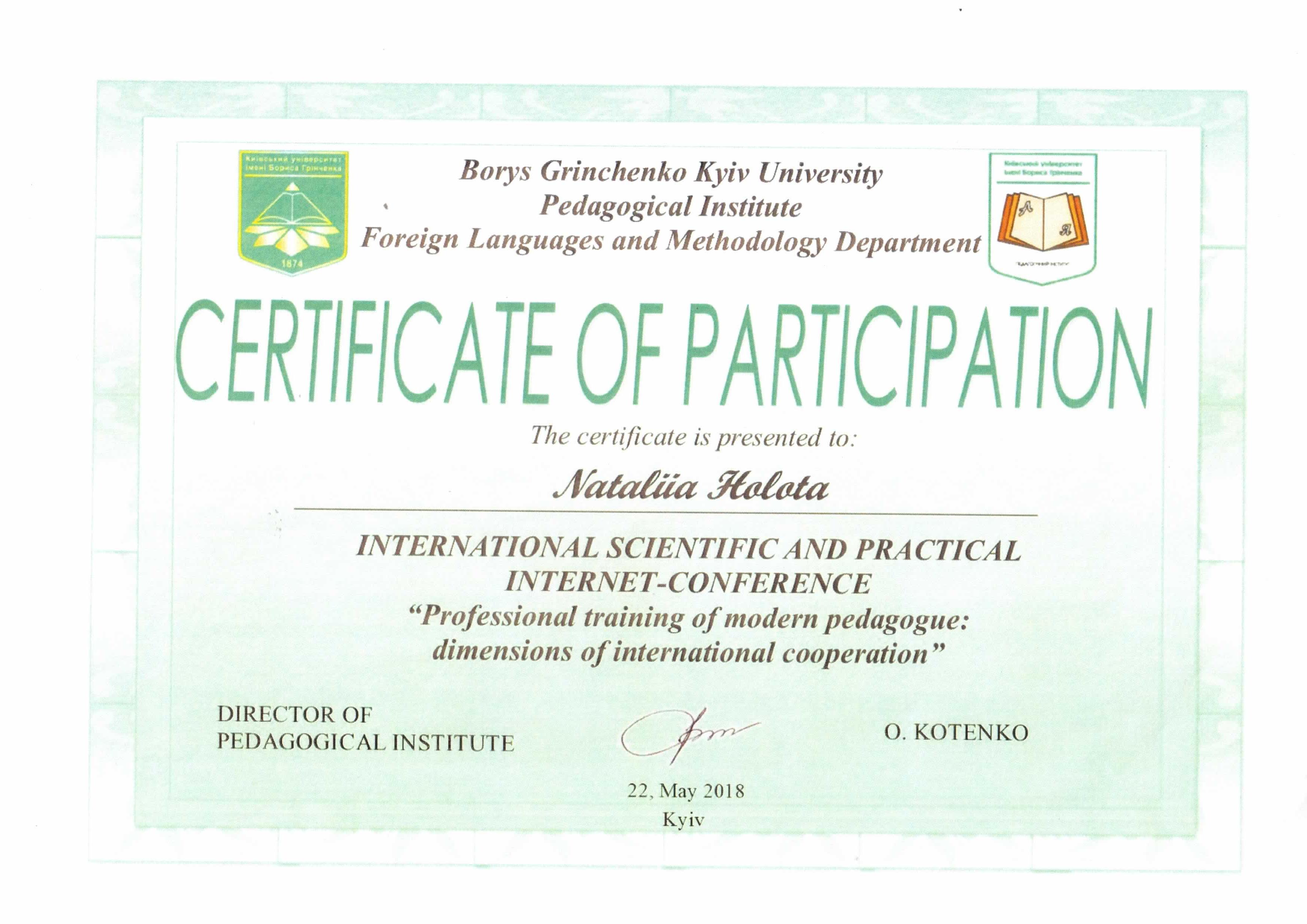 | 4752 | ІІ Міжнародна науково-практична конференція "Сучасні стратегії педагогічної освіти в контексті розбудови суспільства сталого розвитку та євроінтеграції" | Підготовка педагогів до організації педагогічного партнерства з закладами освітив умовах Нової української школи | Україна, м.Київ |