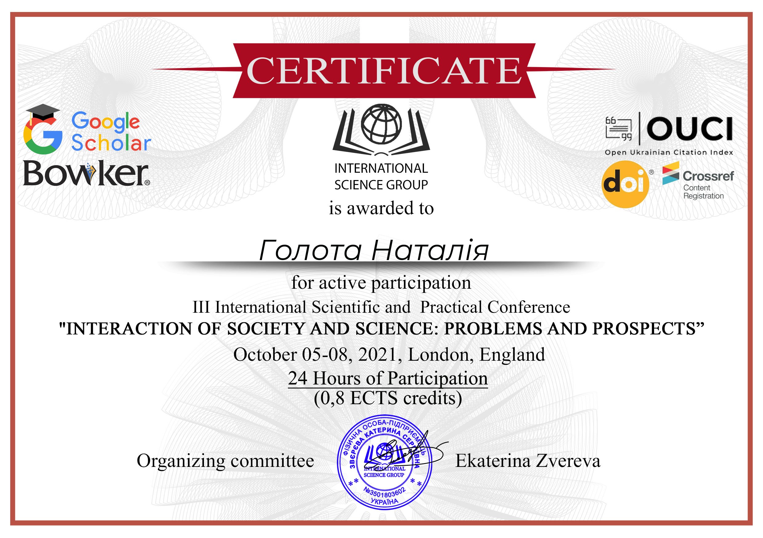 | ID | Назва | Тема доповіді | Місце проведення | Документ, що засвідчує | Дата проведення |