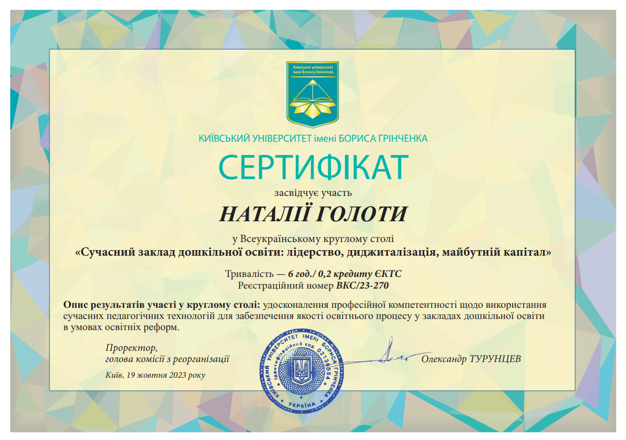 | 9628 | Всеукраїнський круглий стіл «Сучасний заклад дошкільної освіти: лідерство, диджиталізація, майбутній капітал» | удосконалення професійної компетентності щодо використання сучасних педагогічних технологій для забезпечення якості освітнього процесу в здо | м. Київ, КУ імені Бориса Грінченка |