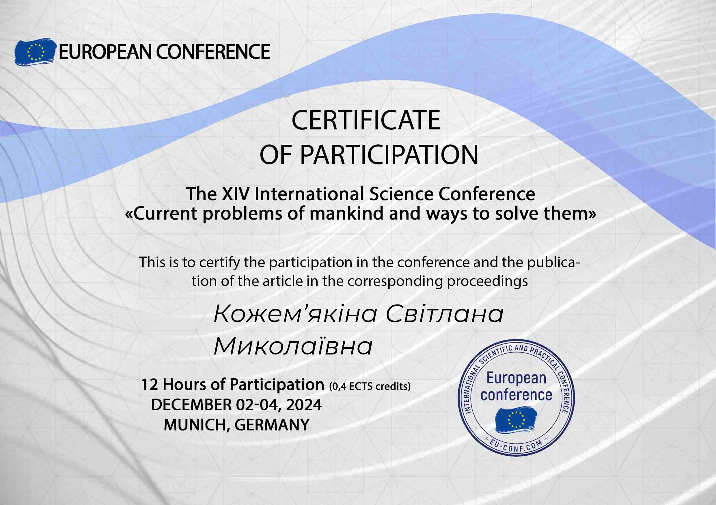 | 12597 | XIII Міжнародна науково-практична конференція «Modern digital technologies and problems of their use» | Шляхи підвищення конкурентоспроможності підприємництва в умовах цифровізації. | Prague, Czech Republic |