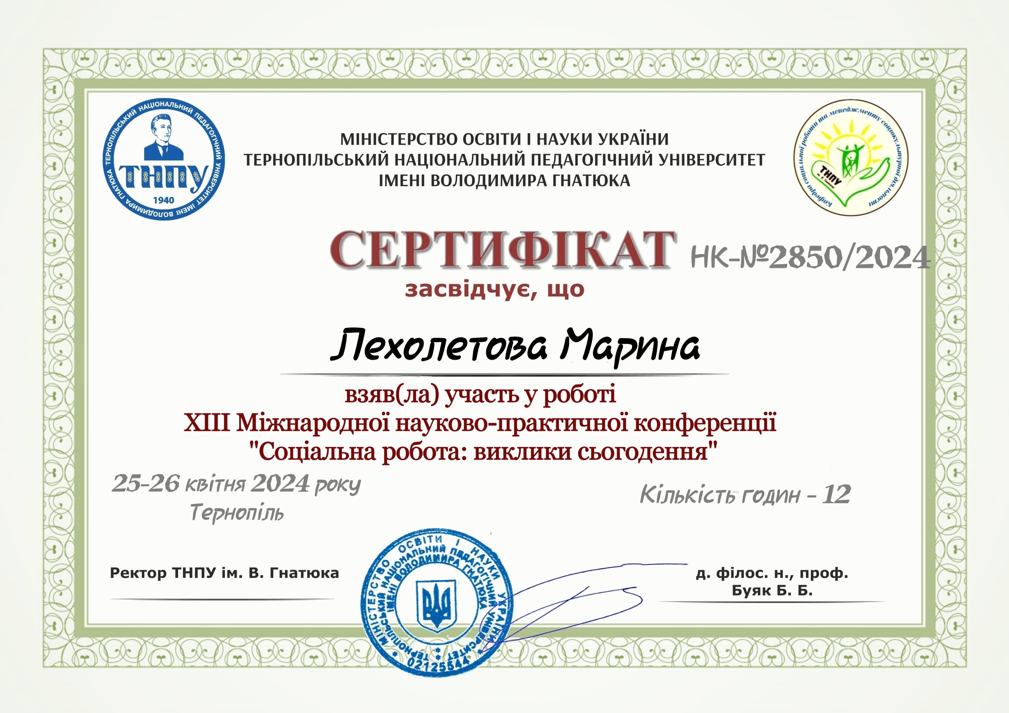 | 10286 | ХІІІ Міжнародна науково-практична конференція «Соціальна робота: виклики сьогодення» | Роль соціального працівника у захисті прав дитини | Тернопільський національний педагогічний університет імені Володимира Гнатюка, м. Тернопіль |