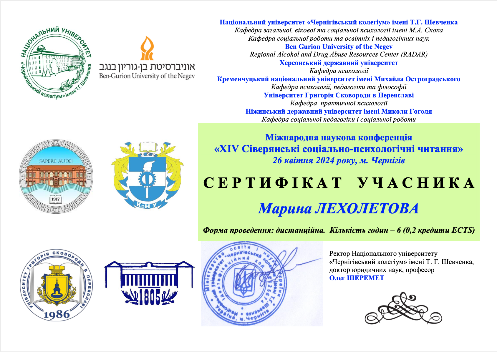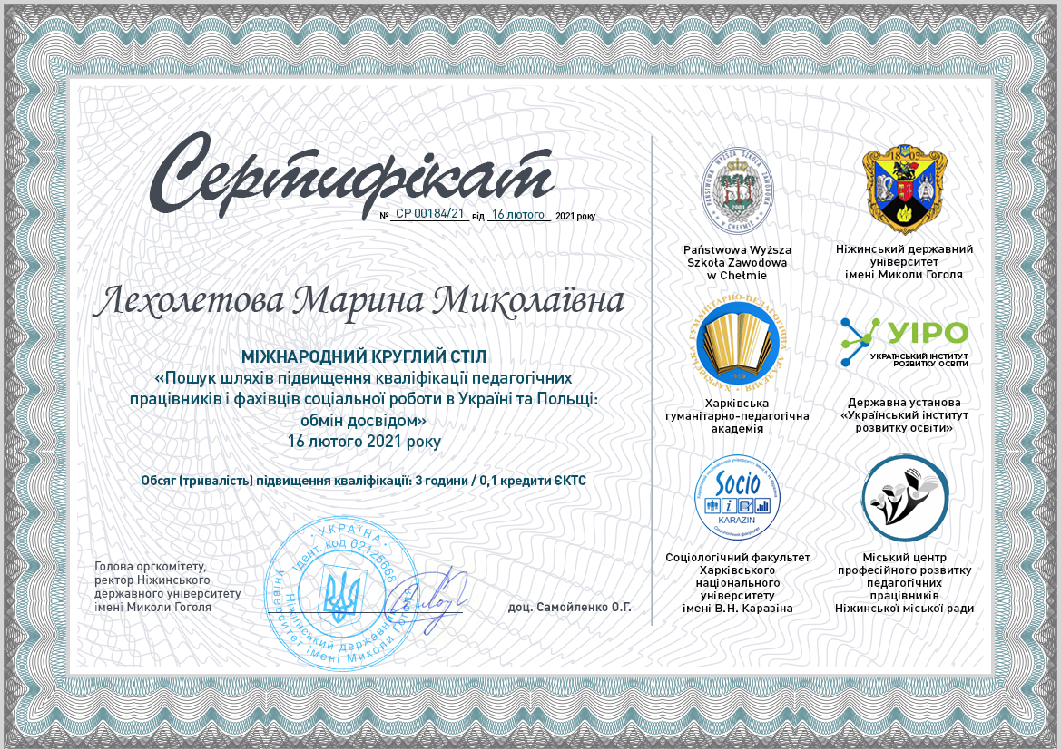 | 6506 | Міжнародний круглий стіл «Пошук шляхів підвищення кваліфікації педагогічних працівників і фахівців соціальної роботи в Україні та Польщі: обмін досвідом» | Участь у дискусійній частині | Київ-Ніжин-Харків-Хелм |