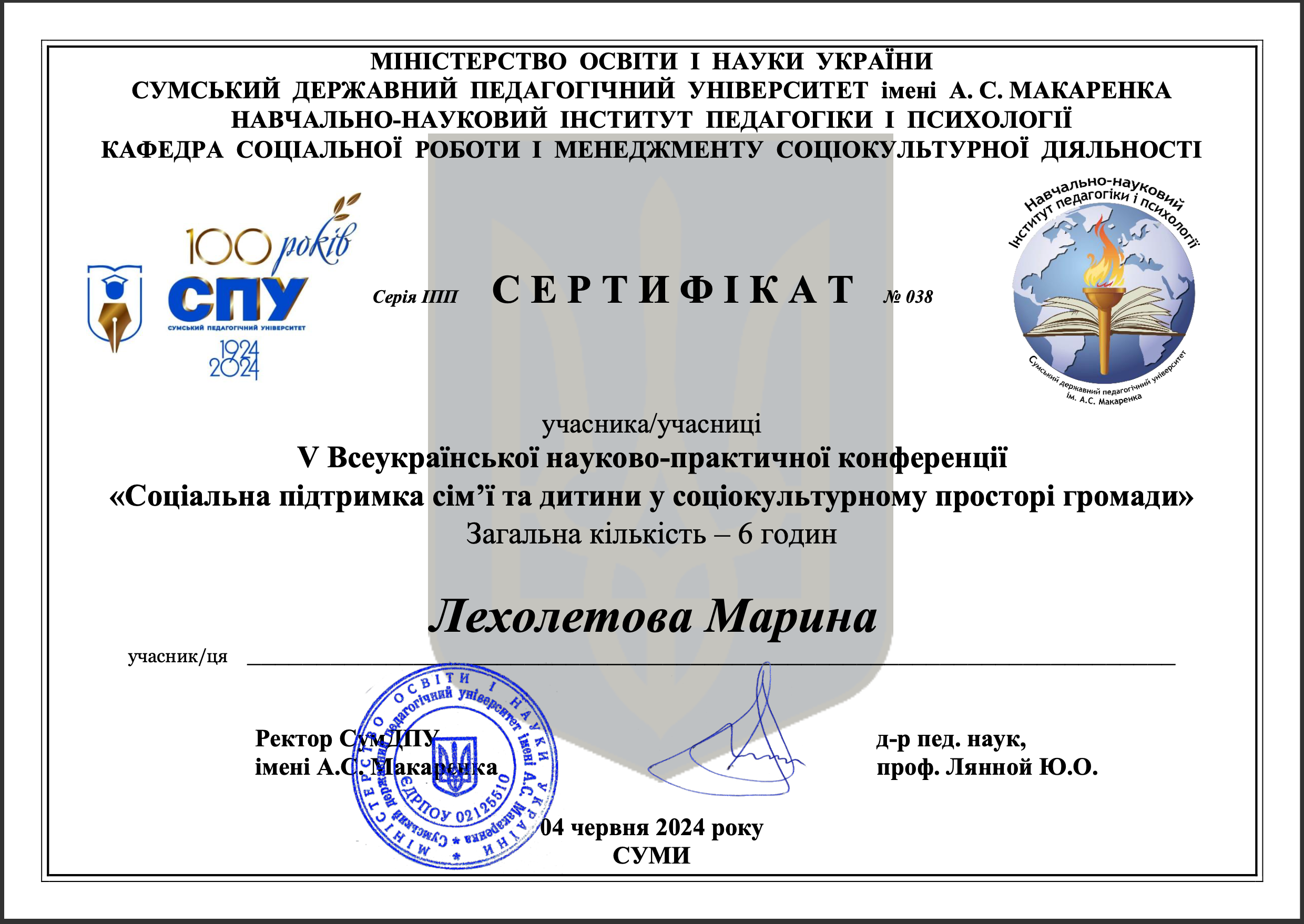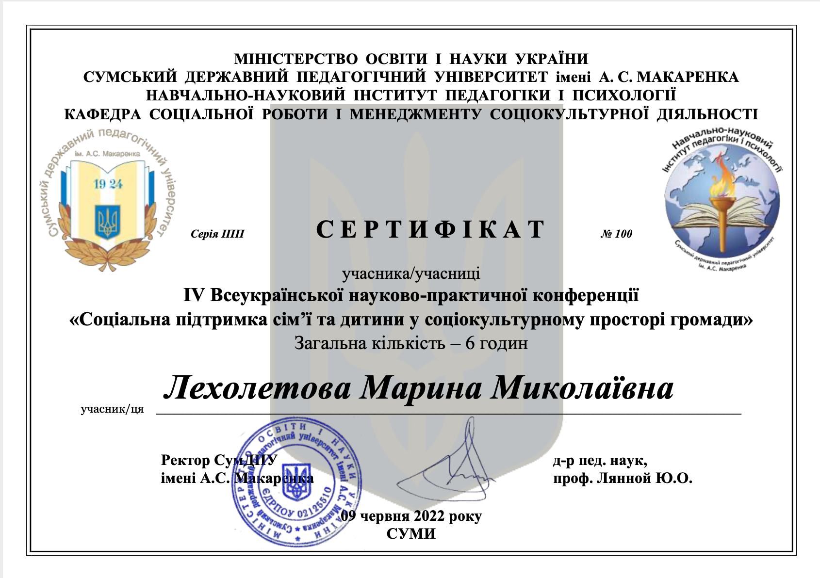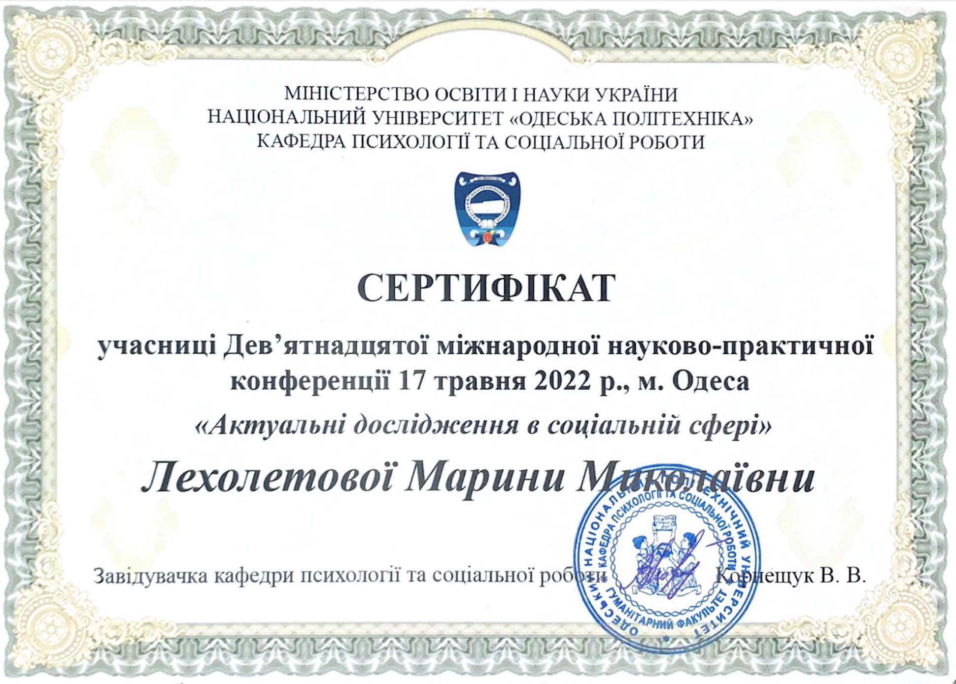 | 62 | Факультет психології, соціальної роботи та спеціальної освіти | Кафедра соціальної педагогіки та соціальної роботи | 207.1 | 4 | 2025 | https://www.researchgate.net/profile/Maryna_Lekholetova |