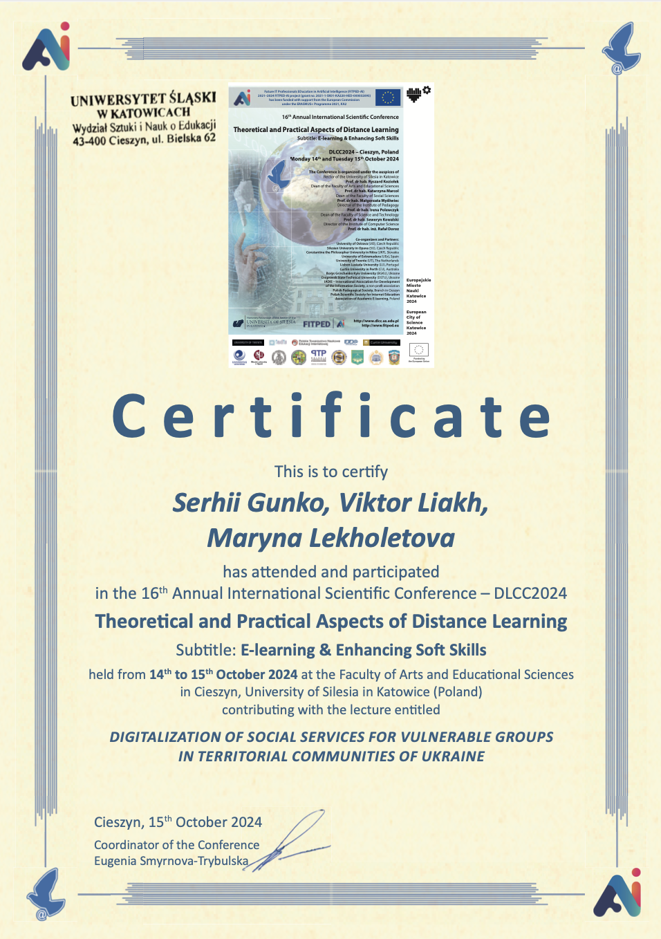 | 10798 | 16th Annual Interna onal Scien fic Conference – DLCC2024 Theore cal and Prac cal Aspects of Distance Learning Sub tle: E-learning & Enhancing So Skills | DIGITALIZATION OF SOCIAL SERVICES FOR VULNERABLE GROUPS IN TERRITORIAL COMMUNITIES OF UKRAINE | Uniwersytet Slaski w Katowicach (Poland) |