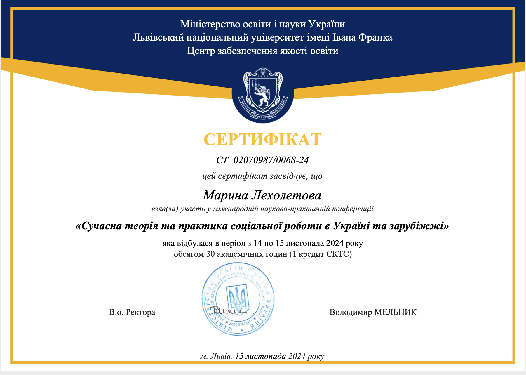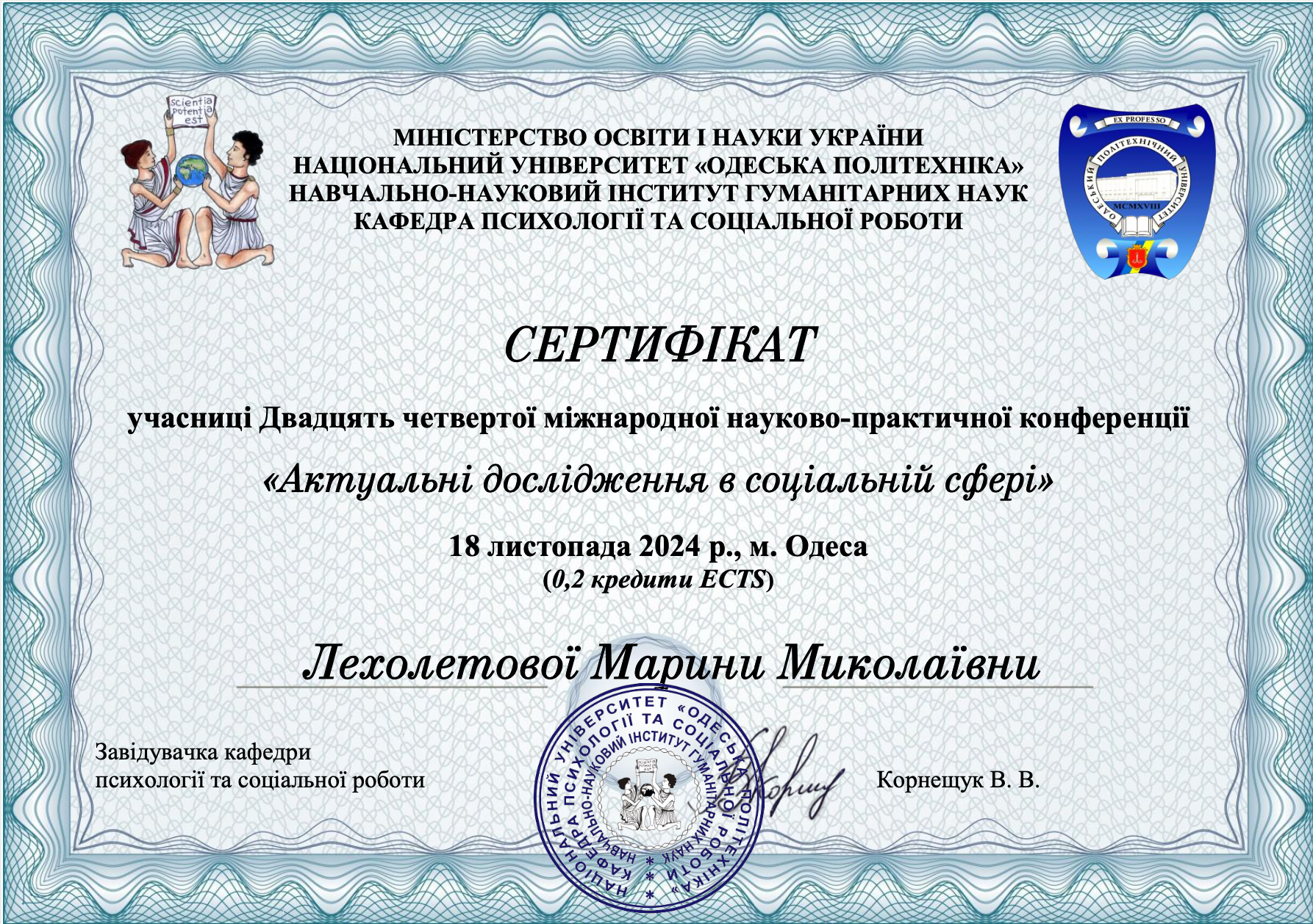 | 11025 | 24-та міжнародна науково-практична конференція "Актуальні дослідження в соціальній сфері" | Соціальна експертиза у менеджменті соціальної роботи | Національний університет "Одеська політехніка", м. Одеса |