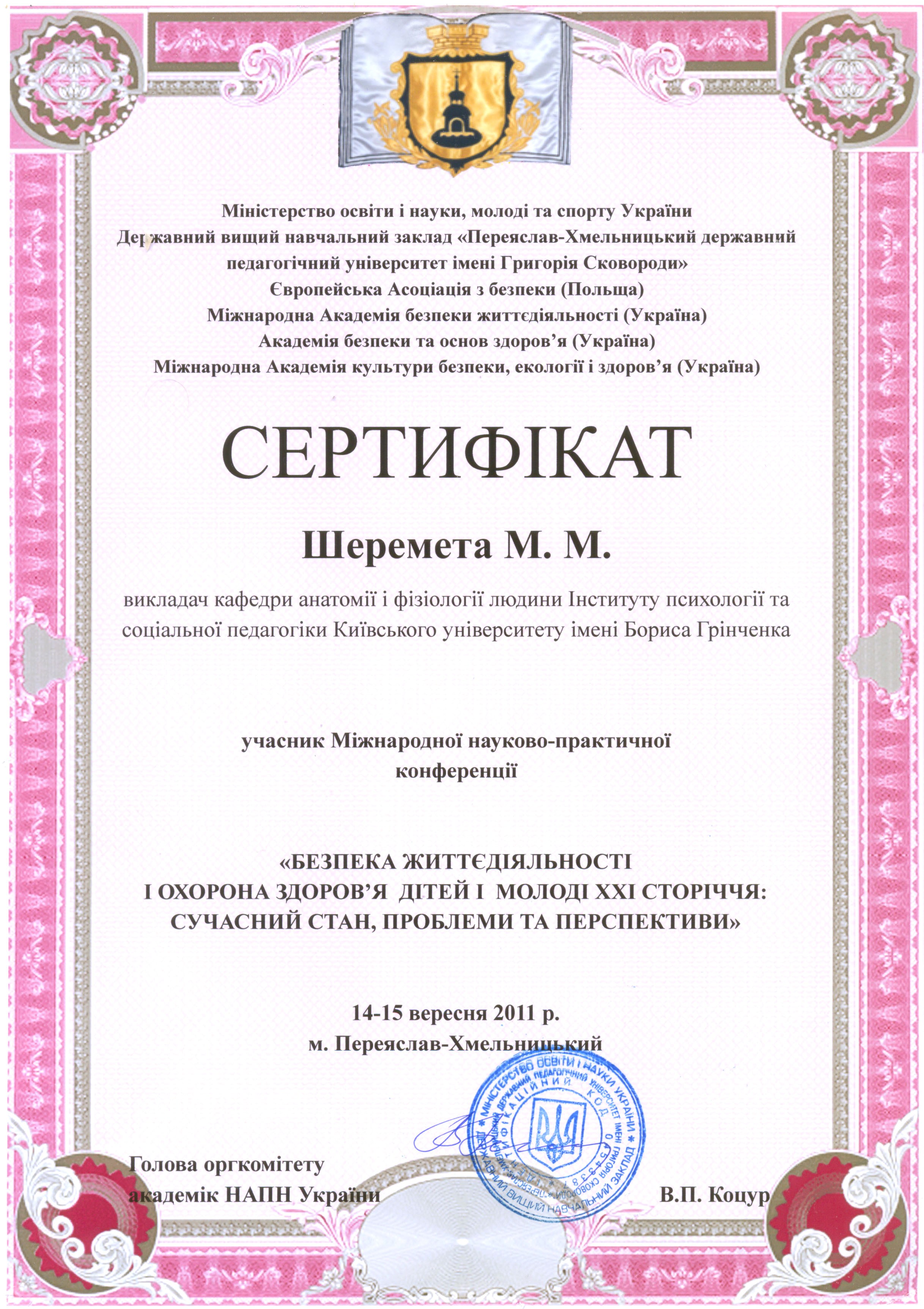 | 1480 | Міжнародна науково-практична конференція «Безпека життєдіяльності і охорона здоров’я дітей і молоді ХХІ сторіччя: сучасний стан, проблеми та перспективи» | Вплив небезпечних та шкідливих факторів на здоров’я людини | Переяслав-Хмельницький ДВНЗ імені Григорія Сковороди |