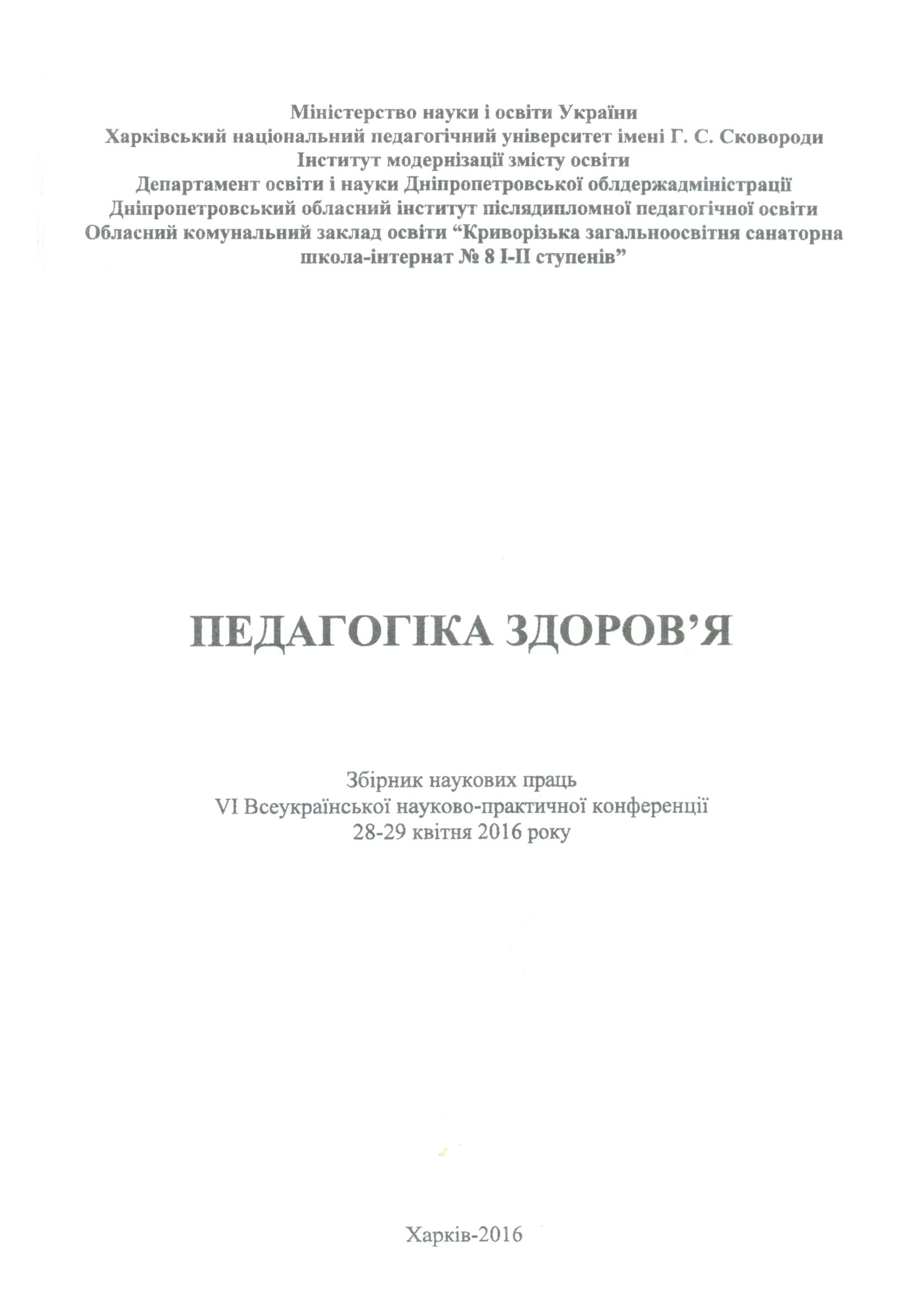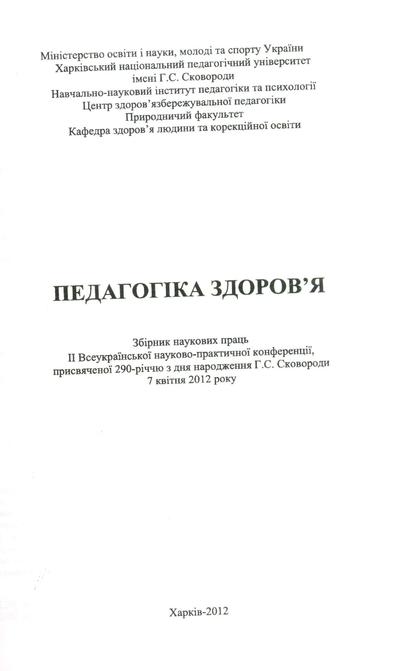 | 1482 | ІІ Всеукраїнська науково-практична конференція «Педагогіка здоров’я» присвячена 290-річчю з дня народження Г. С. Сковороди | Здоров’язберігання майбутніх соціальних педагогів у вищих навчальних закладах як одна з умов професійної підготовки | Харківський національний педагогічний університет імені Григорія Сковороди |