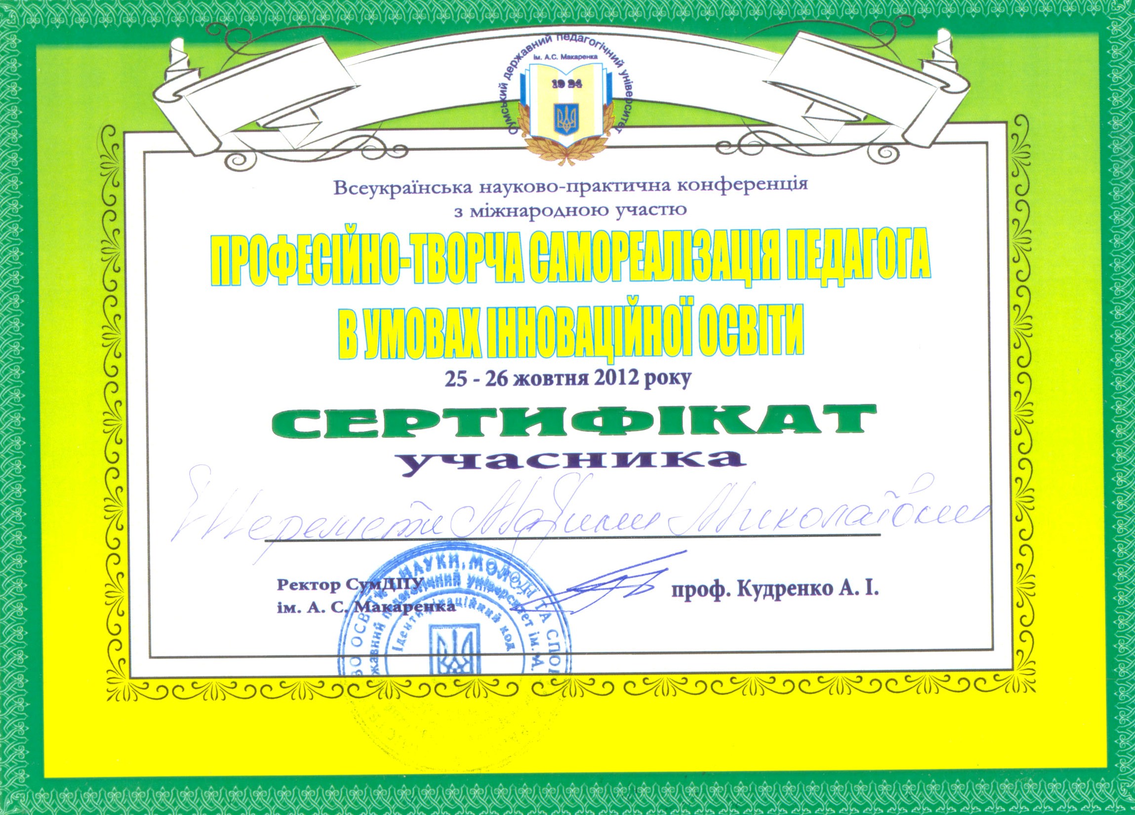 | 1484 | Всеукраїнська науково-практична конференція з міжнародною участю «Професійно-творча самореалізація педагога в умовах інноваційної освіти» | Здоров’язберігальна компетентність студентів – соціальних педагогів та аспекти її формування | Сумський державний педагогічний університет ім. А.С. Макаренка |