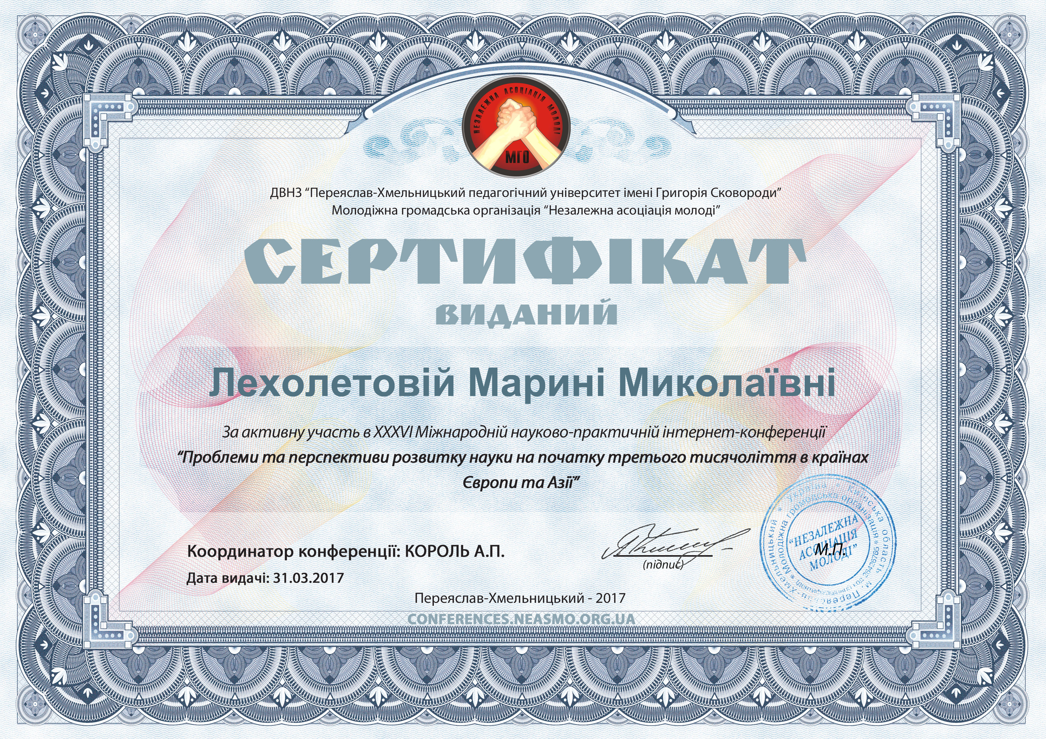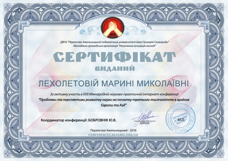 | 1486 | ХXІІ Міжнародна науково-практична інтернет-конференція «Проблеми та перспективи розвитку науки на початку третього тисячоліття у країнах Європи та Азії» | Теоретичні основи здоров’язберігання майбутніх соціальних педагогів у процесі підготовки до професійної діяльності | Переяслав-Хмельницький державний педагогічний університет імені Григорія Сковороди |
