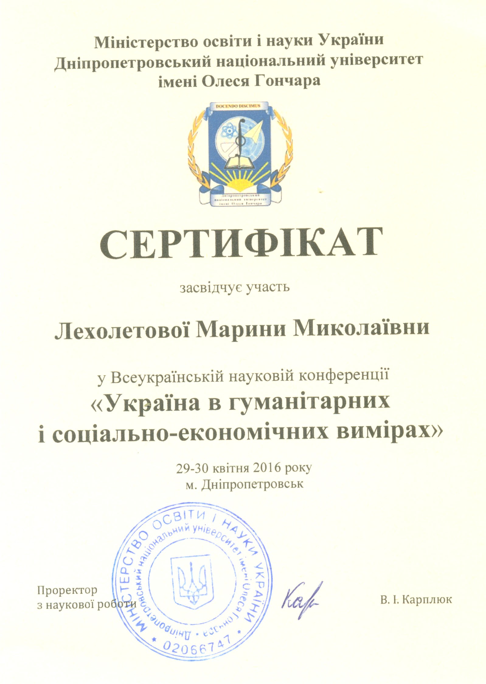 | 1488 | Всеукраїнська наукова конференція «Україна в гуманітарних і соціально-економічних вимірах» | Формування здоров’язберігальної компетентності як завдання професійної підготовки майбутніх фахівців соціальної сфери | Дніпропетровський національний університет імені Олеся Гончара |
