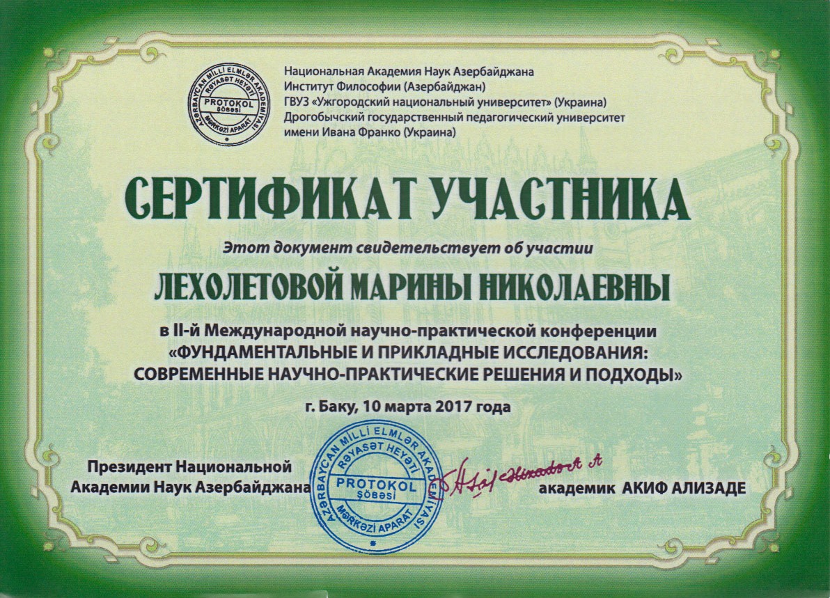 | 1547 | II Международная научно-практическая конференция «Фундаментальные и прикладные исследования: современные научно-практические решения и подходы» | Принципи формування здоров’язберігальної компетентності майбутніх соціальних педагогів | Национальная академия наук Азербайджана (НАНА), г. Баку |