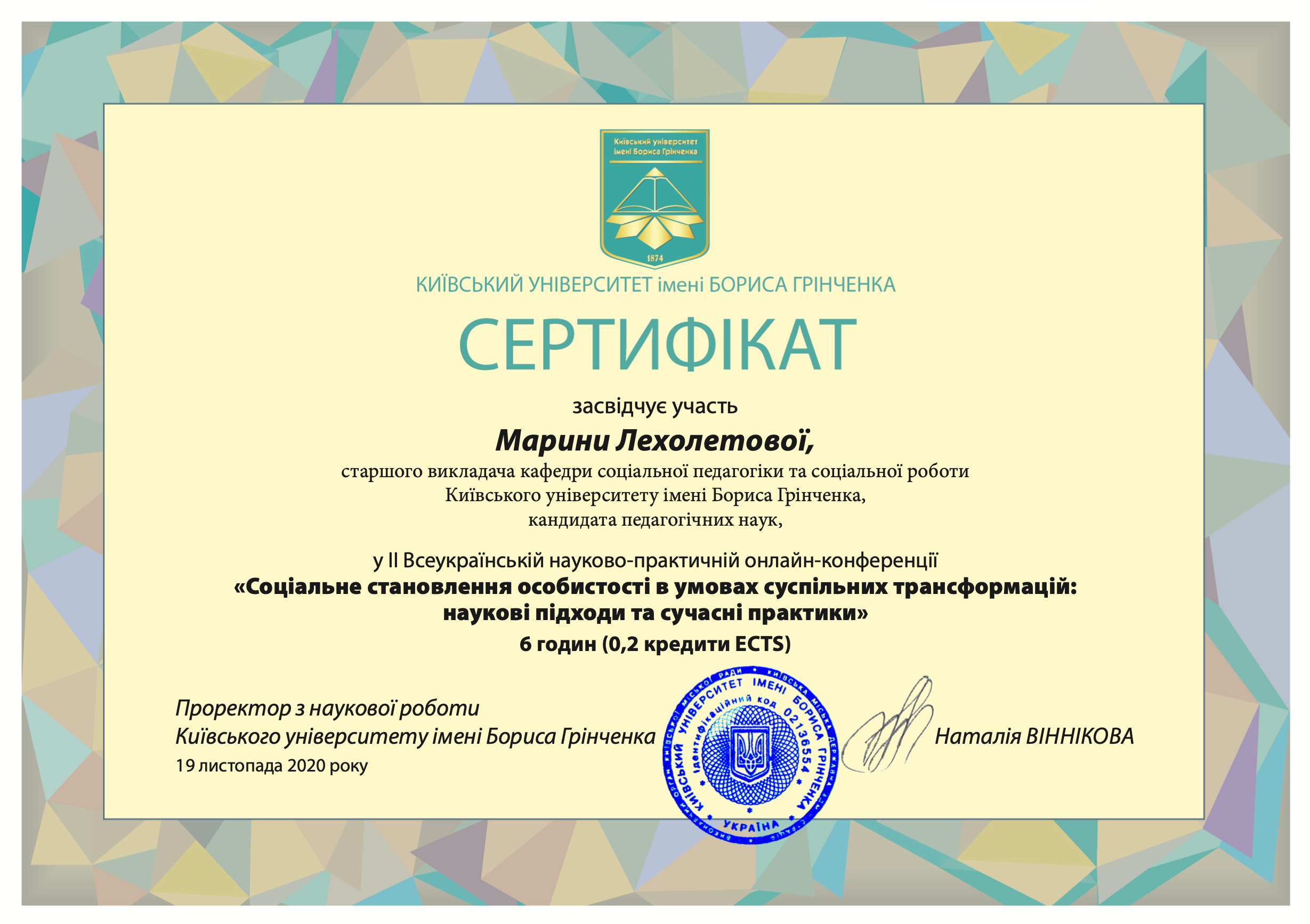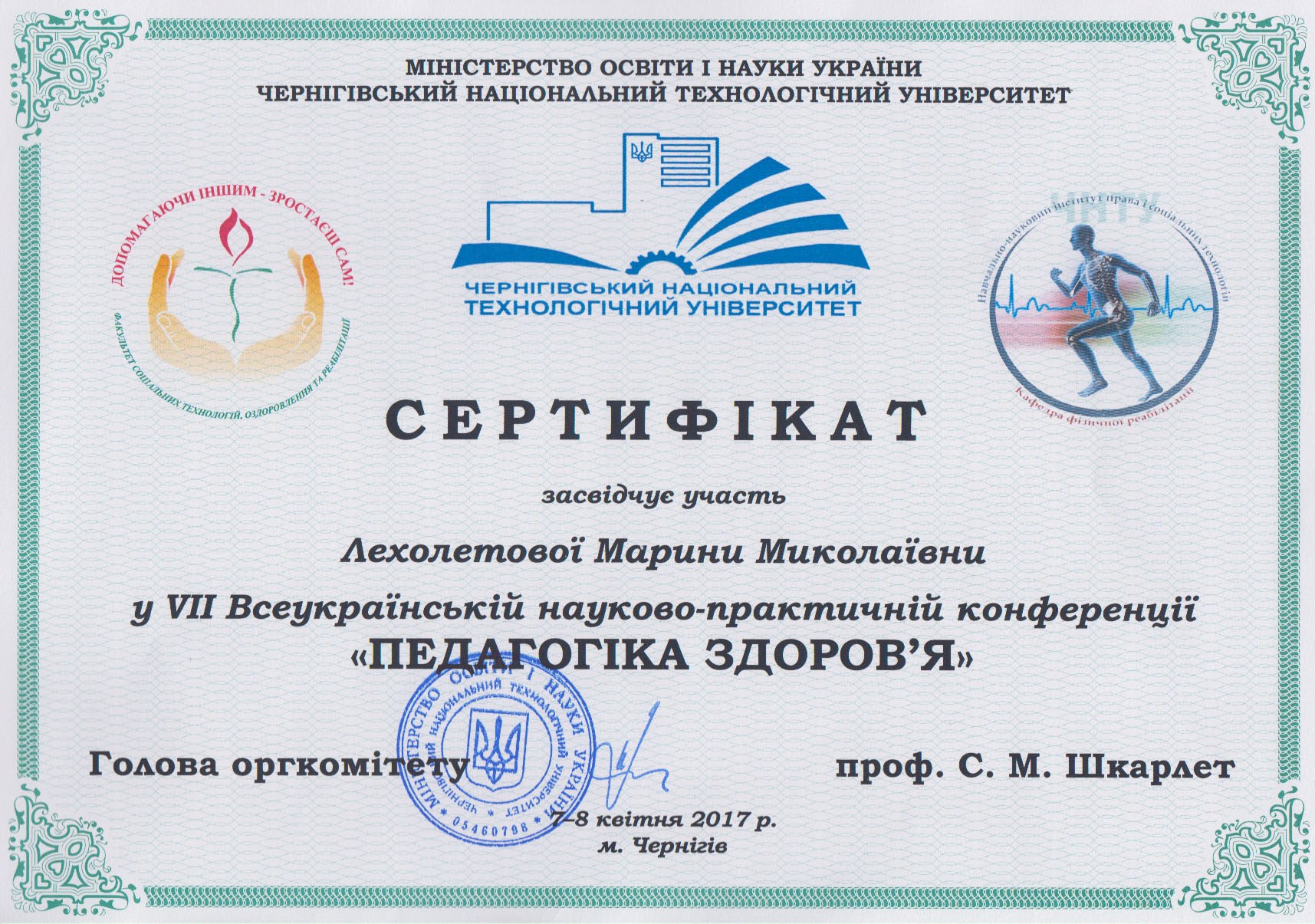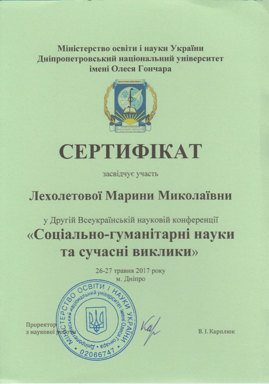| 1728 | ІІ Всеукраїнська наукова конференція «Соціально-гуманітарні науки та сучасні виклики» | Шляхи організації навчального процесу у ВНЗ для формування здоров’язберігальної компетентності майбутніх фахівців соціальної сфери | Дніпровський національний університет імені Олеся Гончара, м. Дніпро |