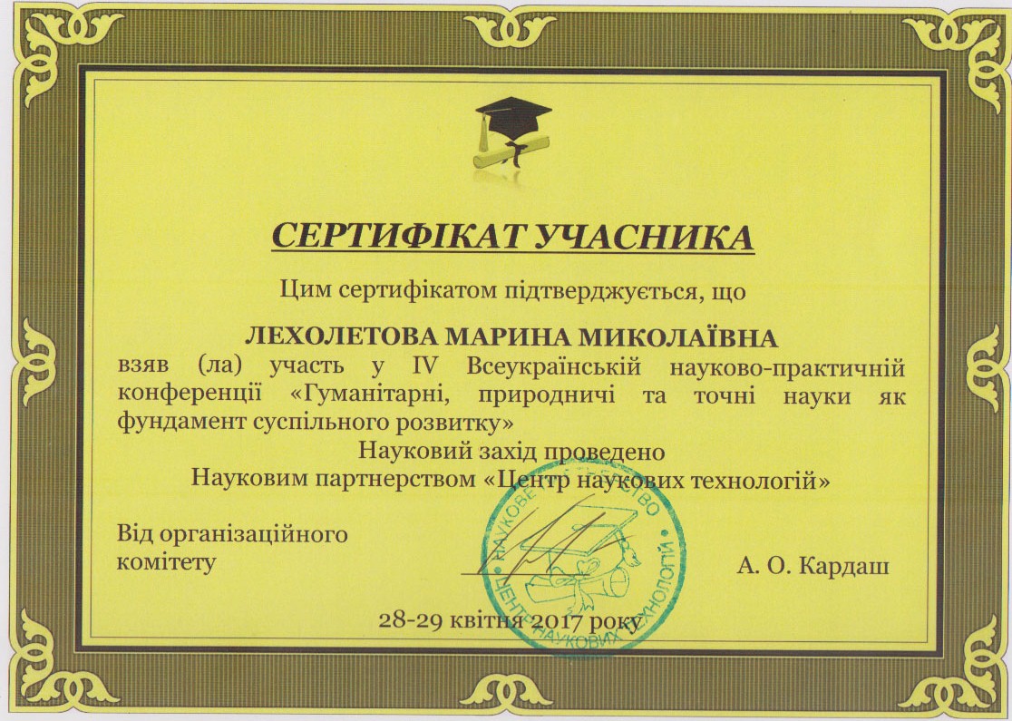 | 1689 | IV Всеукраїнська науково-практична конференція «Гуманітарні, природничі та точні науки як фундамент суспільного розвитку» | Структура здоров’язберігальної компетентності майбутніх соціальних педагогів | Наукове партнерство "Центр наукових технологій", м. Харків |