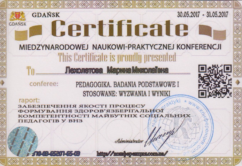| 1757 | Konferencji Miedzynarodow Naukowo-Praktyczn «Pedagogika. Badania podstawowe i stosowane: wyzwania i wyniki» | Забезпечення якості процесу формування здоров’язберігальної компетентності майбутніх соціальних педагогів у ВНЗ | miasto Gdańsk (Polska) |