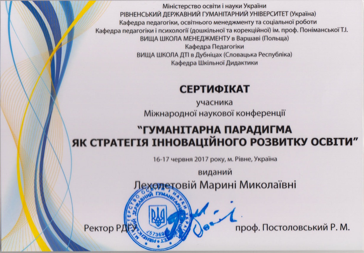 | 1886 | Міжнародна наукова конференція «Гуманітарна парадигма як стратегія інноваційного розвитку освіти» | Формування зоров’язберігальної компетентності майбутніх соціальних педагогів у навчально-дослідницькій діяльності | Рівненський Державний Гуманітарний Університет |