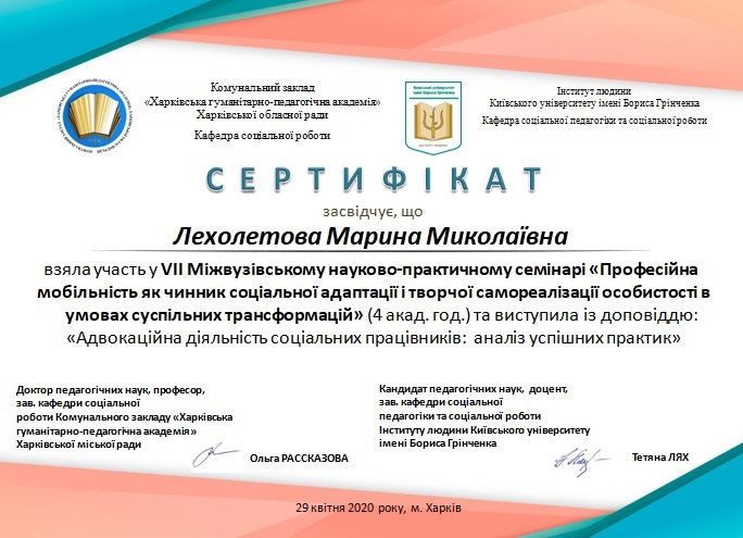 | 5317 | VII Міжвузівський науково-практичний семінар «Професійна мобільність як чинник соціальної адаптації і творчої самореалізації особистості в умовах суспільних трансформацій» | Адвокаційна діяльність соціальних працівників: аналіз успішних практик | Комунальний заклад «Харківська гуманітарно-педагогічна академія» Харківської обласної ради |