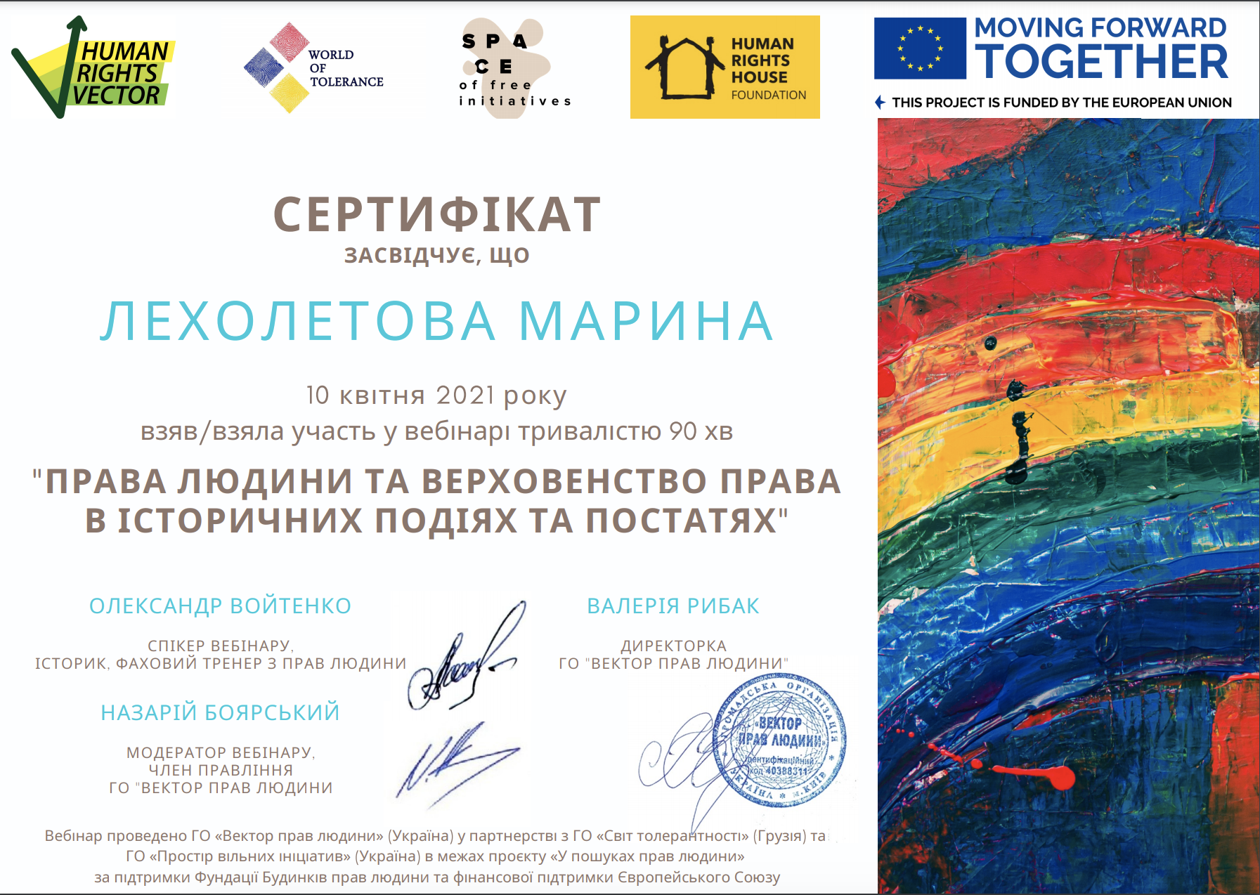 | 6716 | Вебінар «Права людини та верховенство права в історичних подіях та постатях» | Слухач. Участь у дискусійній частині | Онлайн (за Київським часом) |