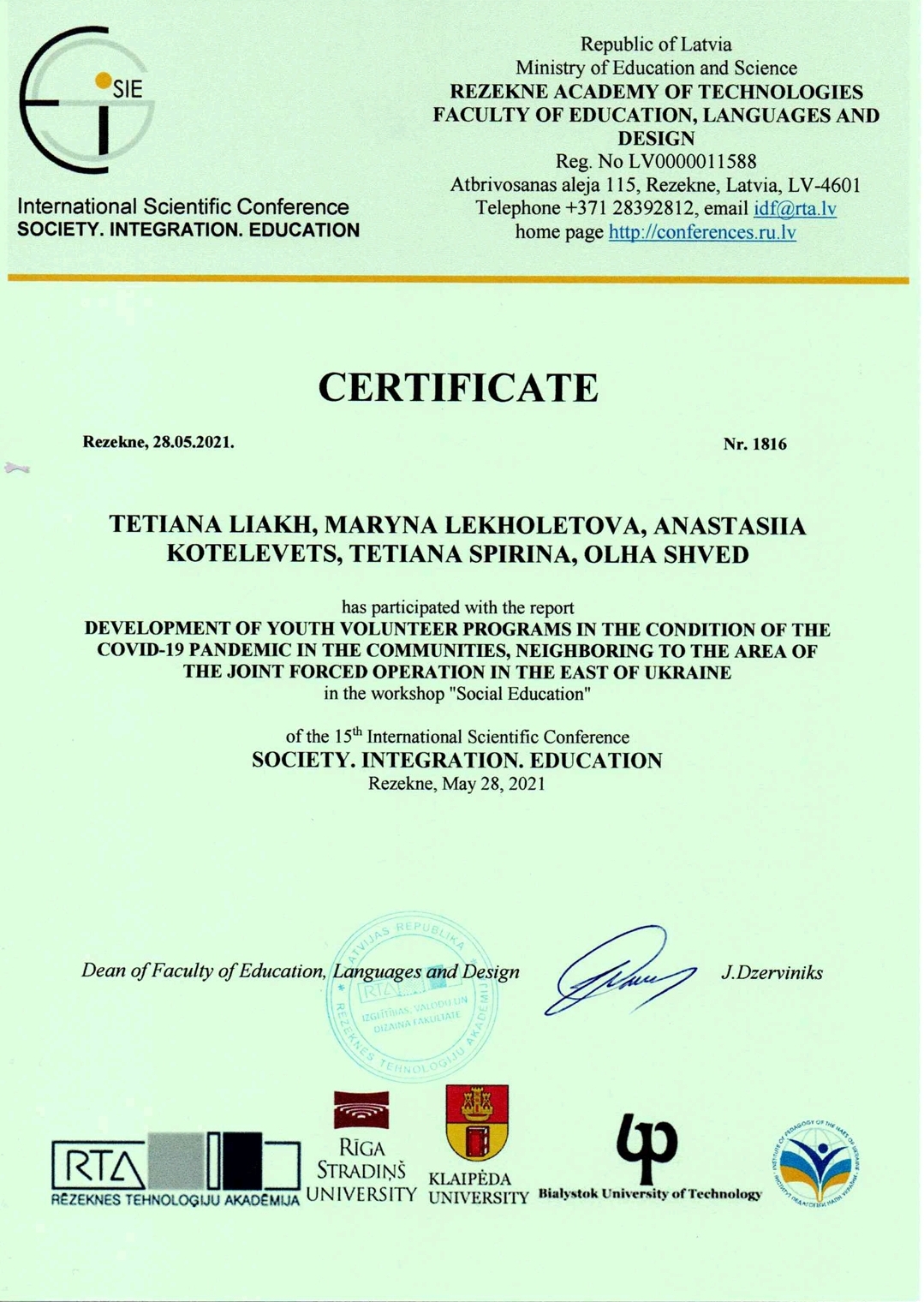 | 6840 | 15th International Scientific Conference „Society. Integration. Education” (SIE2021) | Development of youth volunteer programs in the condition of the Covid-19 pandemic in the communities, neighboring to the area of the joint forced operation in the east of Ukraine | Latvia, Rezekne Academy of Technologie (virtual format Zoom platform) |