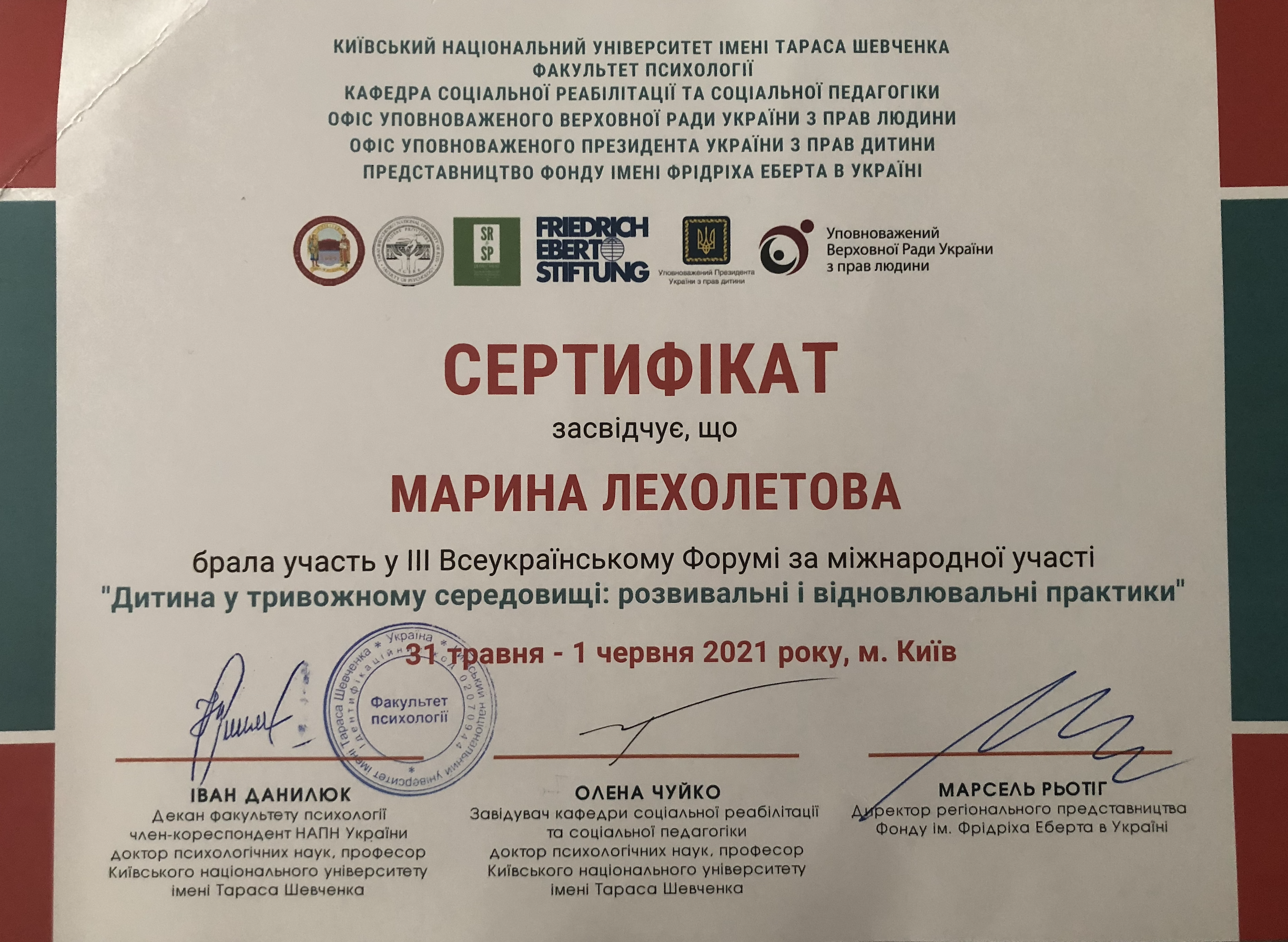 | 6970 | ІІІ Всукраїнський Форум за міжнародної участі "Дитина у тривожному середовищі: розвивальні і відновлювальні практики" | Слухач. Участь у дискусійній частині | Київський національний університет імені Тараса Шевченка |