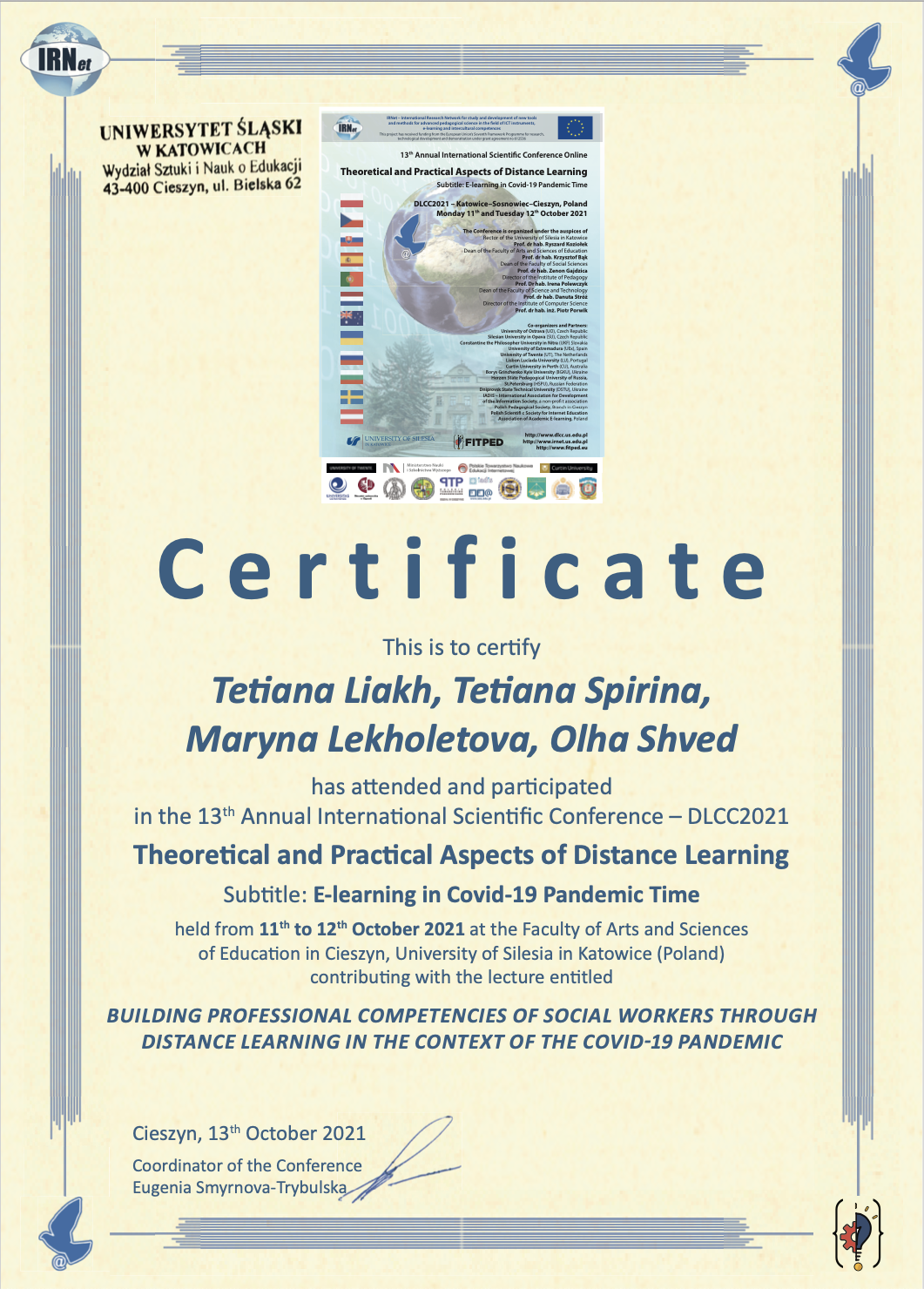 | 7109 | 13th Annual International Scientific Conference Online Theoretical and Practical Aspects of Distance Learning | Building Professional Competencies of Social Workers through Distance Learning in the Context of the Covid-19 Pandemic | University of Silesia in Katowice (Poland) |