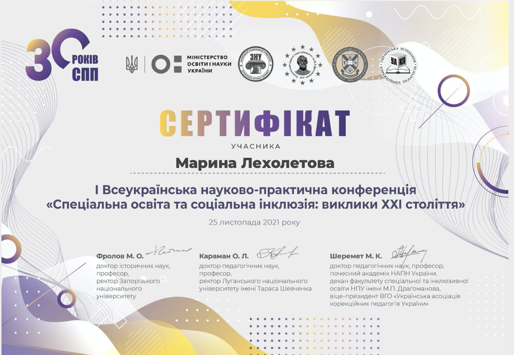 | 8144 | Всеукраїнська науково-практична конференція "Актуальні питання спеціальної та інклюзивної освіти: виклик сьогодення" | Менеджмент соціального та інклюзивного середовища | ДЗ «Луганський національний університет імені Тараса Шевченка» | document.pdf | |