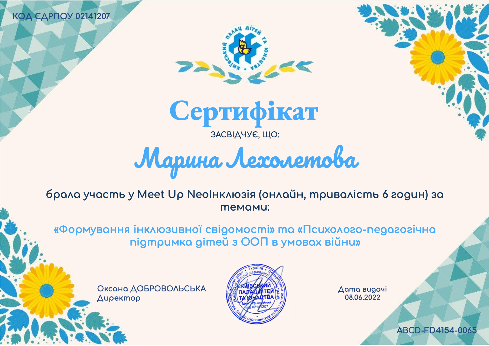 | 8089 | Meet Up NeoІнклюзія Формування інклюзивної свідомості» та «Психолого-педагогічна підтримка дітей з ООП в умовах війни | Слухач. Участь у дискусійній частині | Київський Палац дітей та юнацтва (м. Київ) |