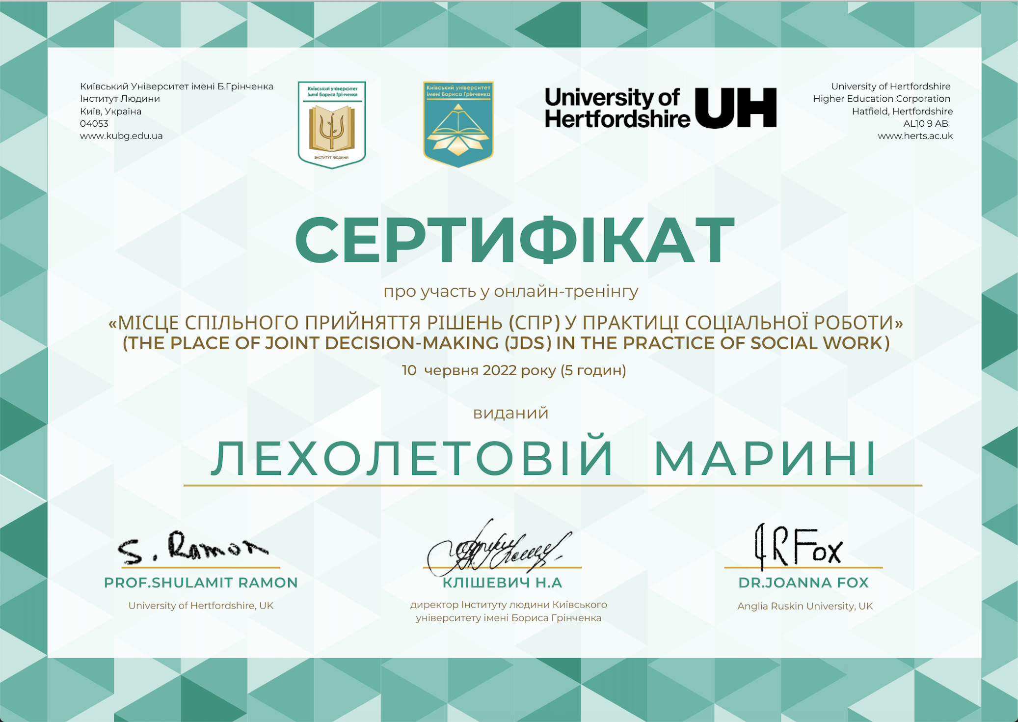 | 8212 | Місце спільного прийняття рішень (СПР) у практиці соціальної роботи | Учасник тренінгу | Онлайн (за Київським часом) |