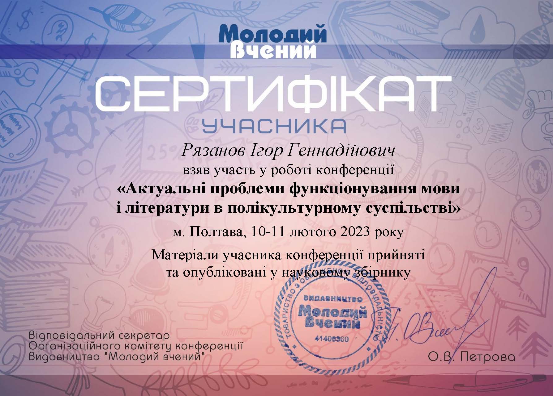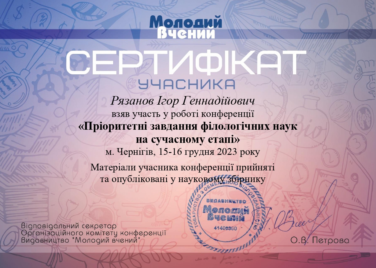 | 739 | Факультет романо-германської філології | Кафедра лінгвістики та перекладу | 4 | 0 | 2025 | https://www.researchgate.net/profile/Ihor-Riazanov |