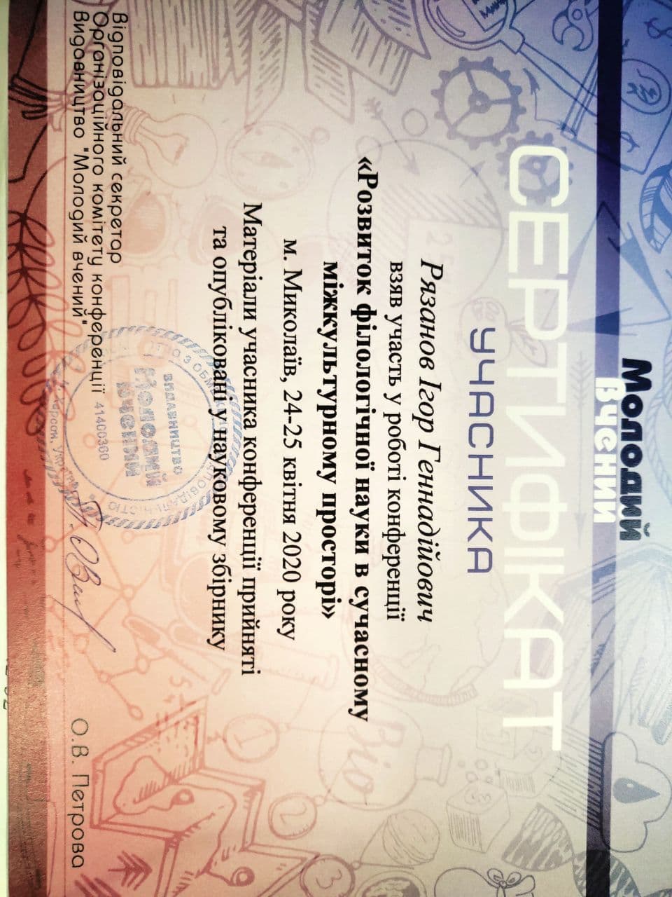 В 2024 році здобув науковий ступінь доктора філософії у Київському університеті імені Бориса Грінченка за спеціальністю 035 «Філологія» галузі знань 03 «Гуманітарні науки».
