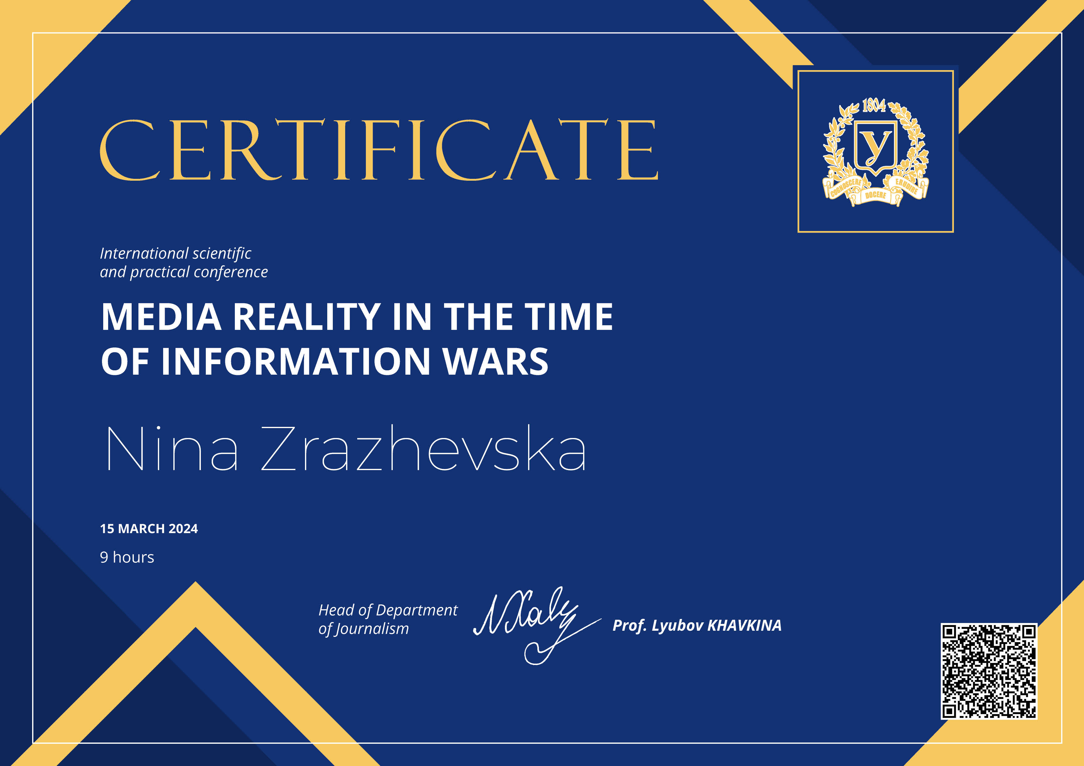 | 720 | Факультет журналістики | Кафедра міжнародної журналістики | 42.8 | 3 | 2025 | https://www.researchgate.net/profile/Nina-Zrazhevska |