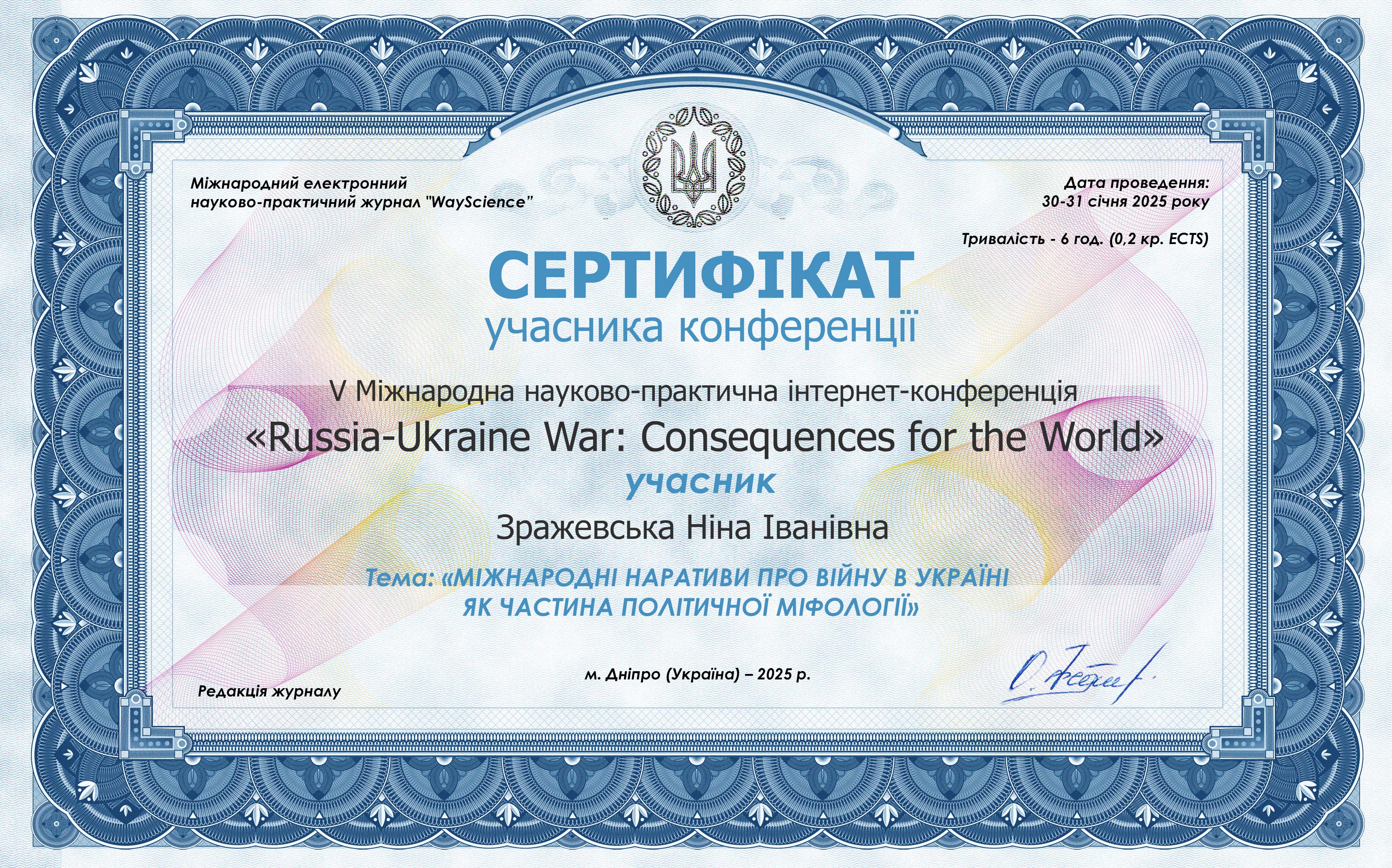 | 11578 | 5th International Scientific and Practical Internet Conference "Russia-Ukraine War: Consequences for the World" is devoted to impact of military actions on situation in the world. | (MIЖHAPOДHI HAPATИВИ ПPO BIЙHУ...) | Дніпро |
