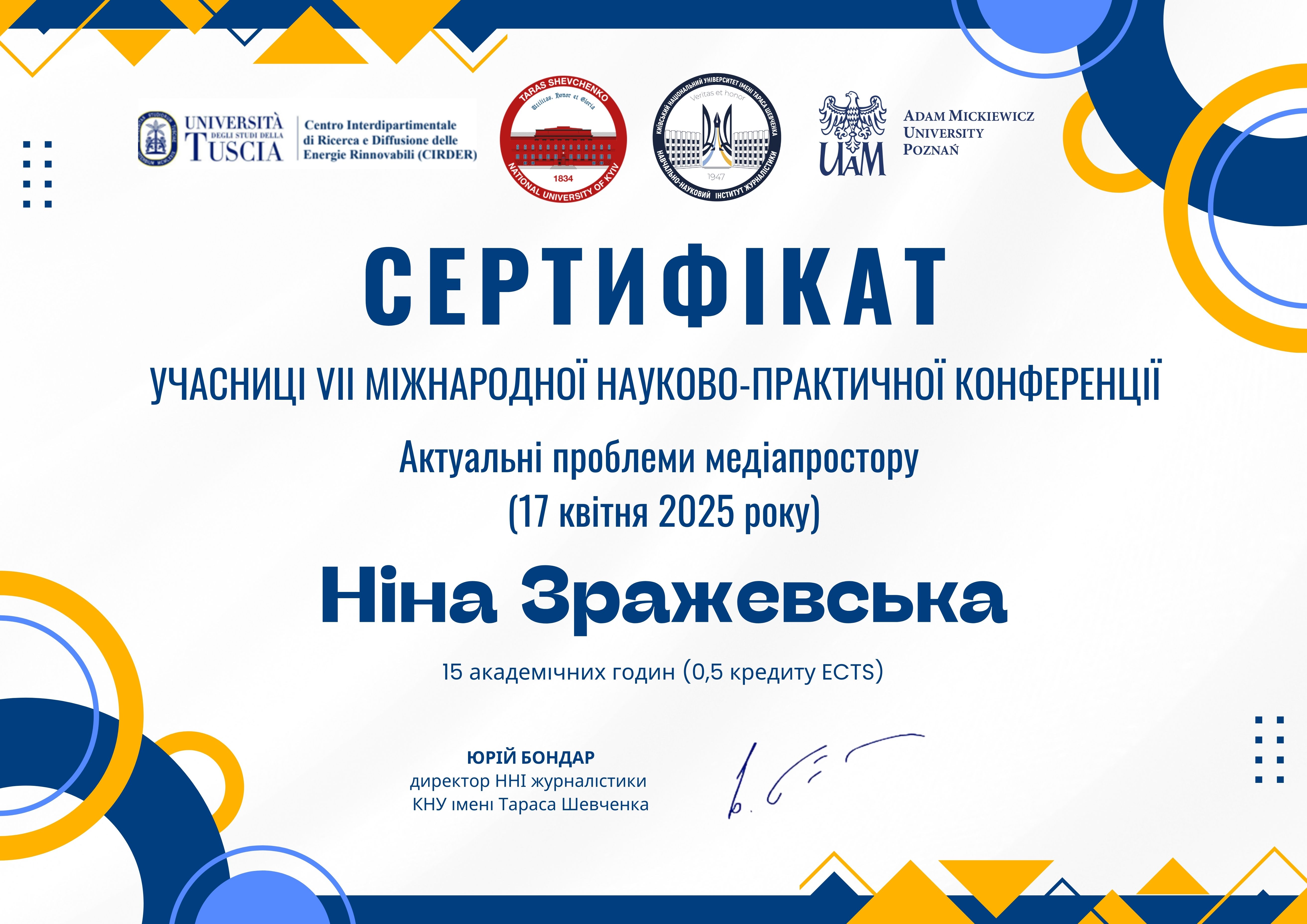 | ID | Назва | Тема доповіді | Місце проведення | Документ, що засвідчує | Дата проведення |