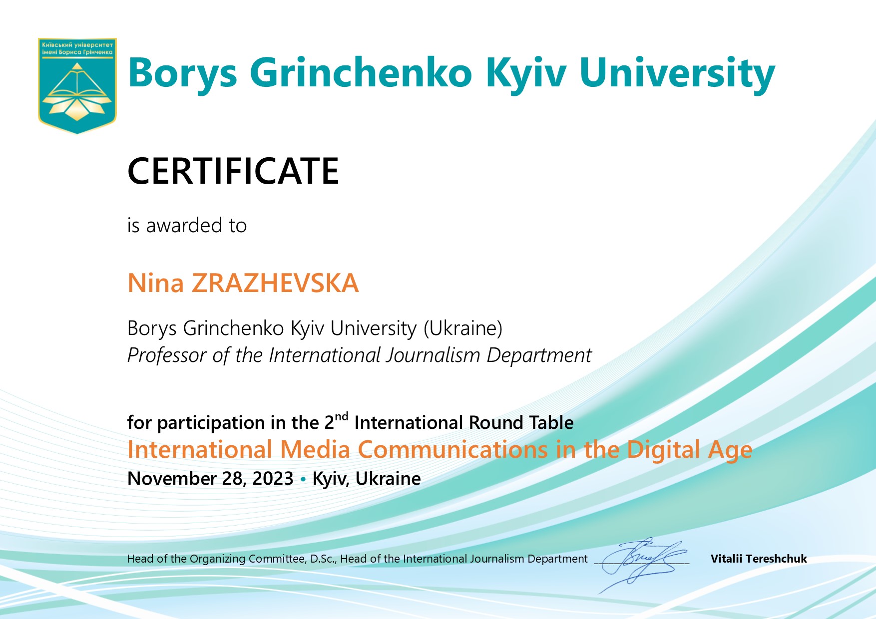 2020 – професор кафедри журналістики та нових медіа Університету ім. Б. Грінченка.