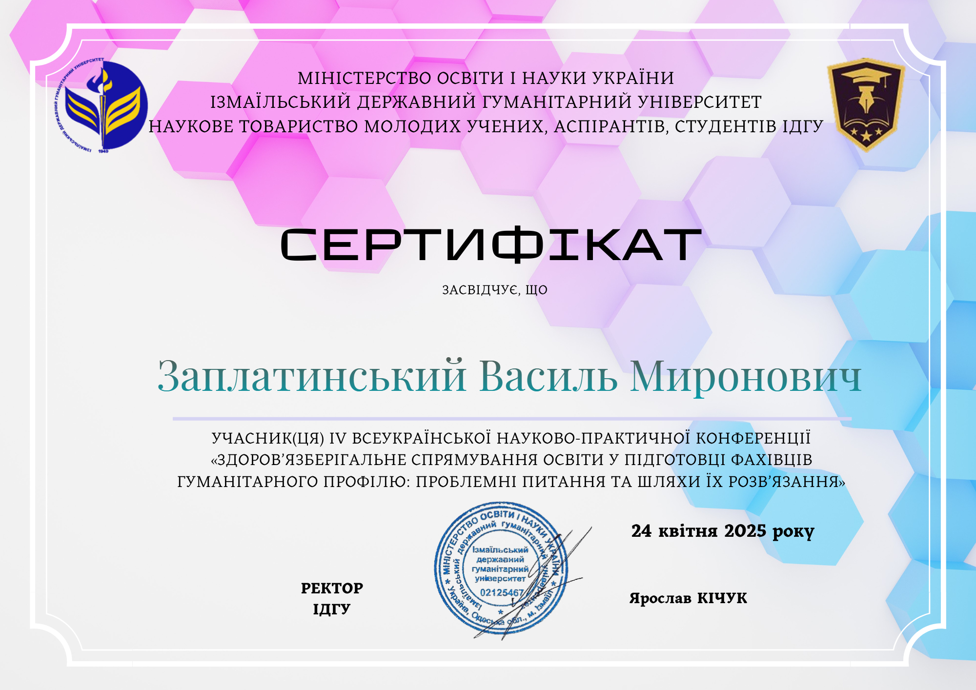 | 11772 | ІV Всеукраїнська науково-практична конференція «ЗДОРОВ’ЯЗБЕРІГАЛЬНЕ СПРЯМУВАННЯ ОСВІТИ У ПІДГОТОВЦІ ФАХІВЦІВ ГУМАНІТАРНОГО ПРОФІЛЮ: ПРОБЛЕМНІ ПИТАННЯ ТА ШЛЯХИ ЇХ РОЗВ’ЯЗАННЯ" | Підготовка фахівців здоров'язбережувальна освітньої галузі | Ізмаїл |