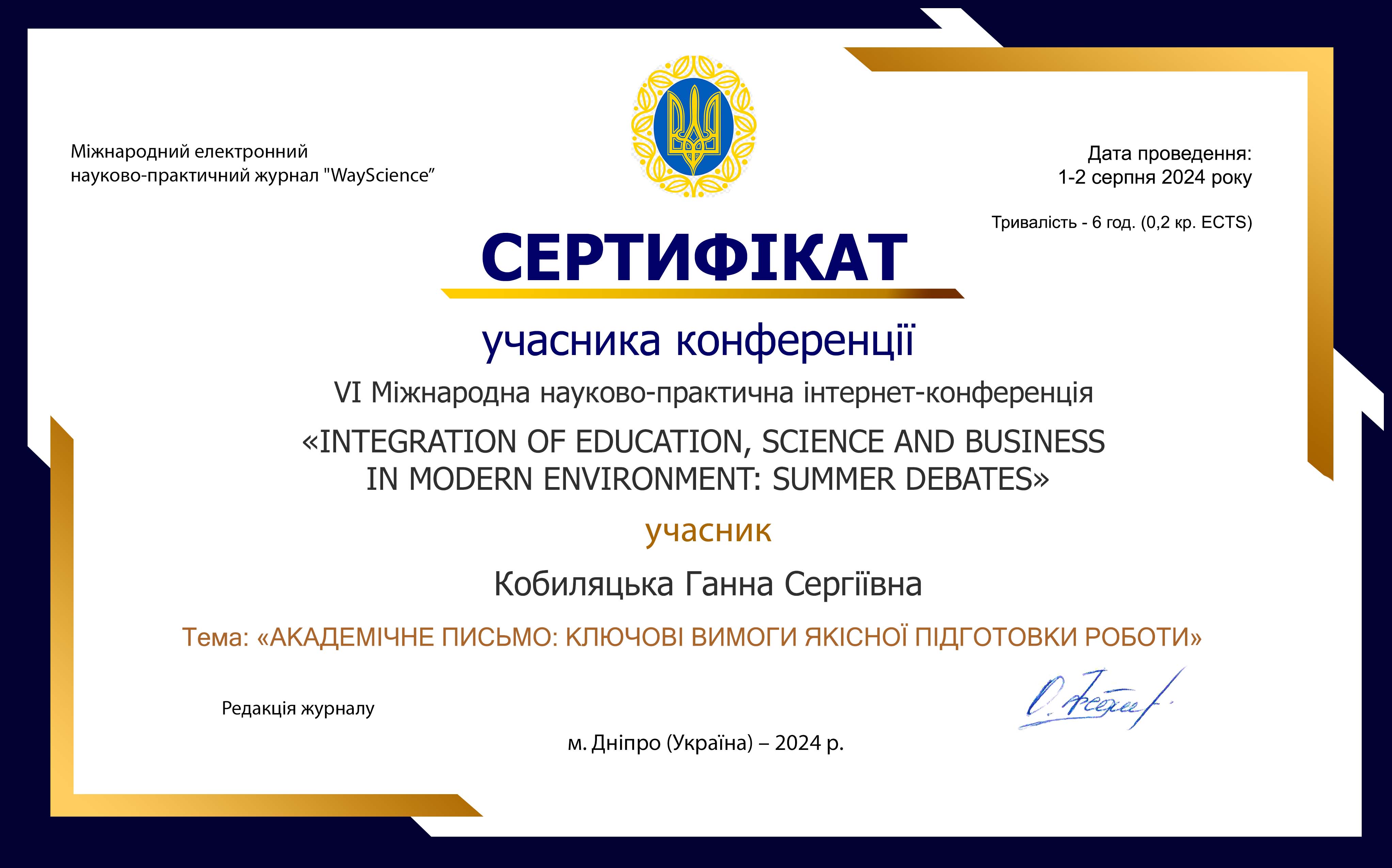 | 10976 | Міжнародна науково-практична конференція "Integration of education, science and business in modern environment: summer debates" | "Академічне письмо: ключові вимоги якісної підготовки роботи" | м. Дніпро |