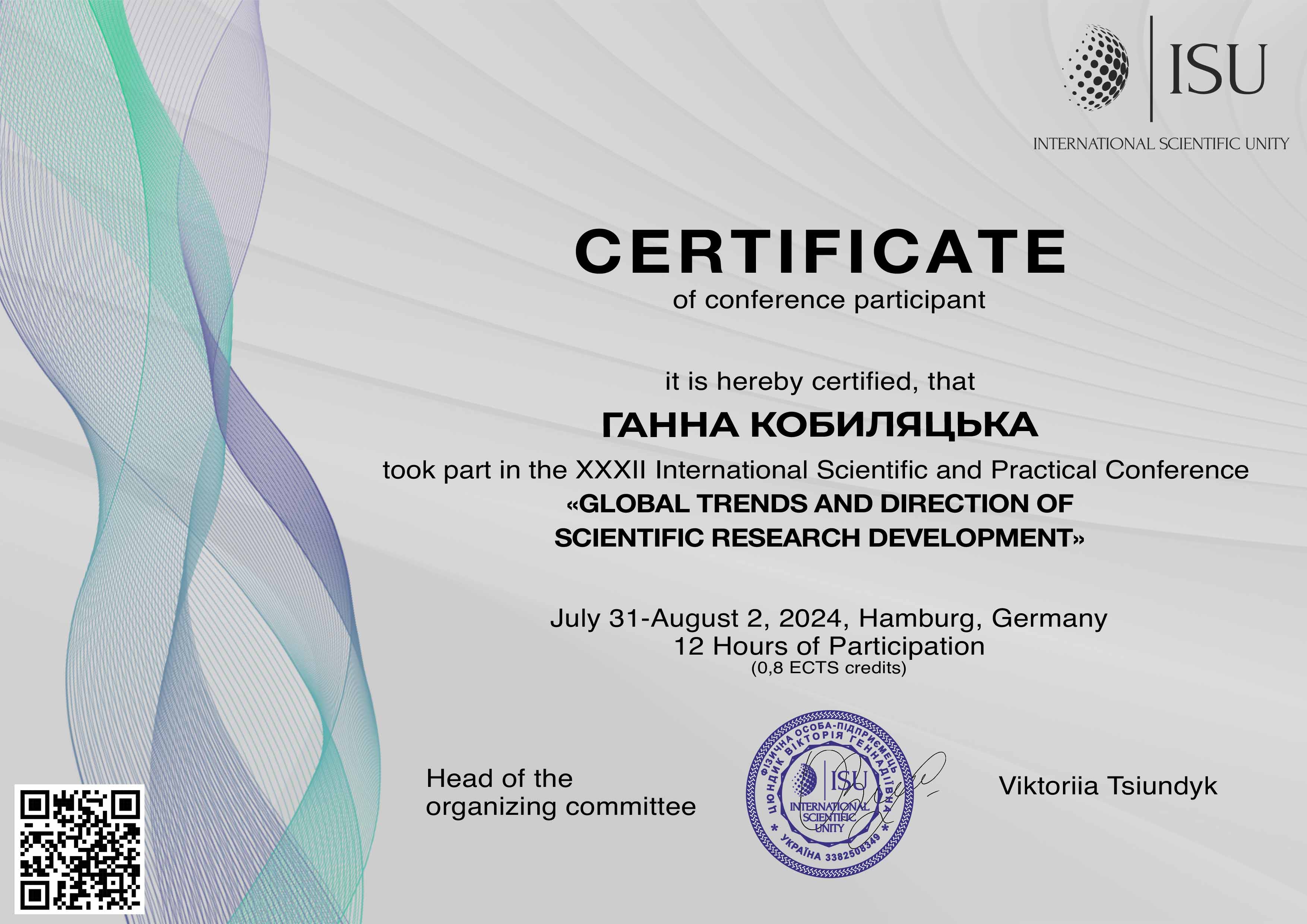 | 10977 | Міжнародна наукова-практична конференція "Global trends and direction of scientifical research development" | "Опера - найвеличніше досягнення всіх часів" | ISU - International scientific Unity, Hamburg, Germany |