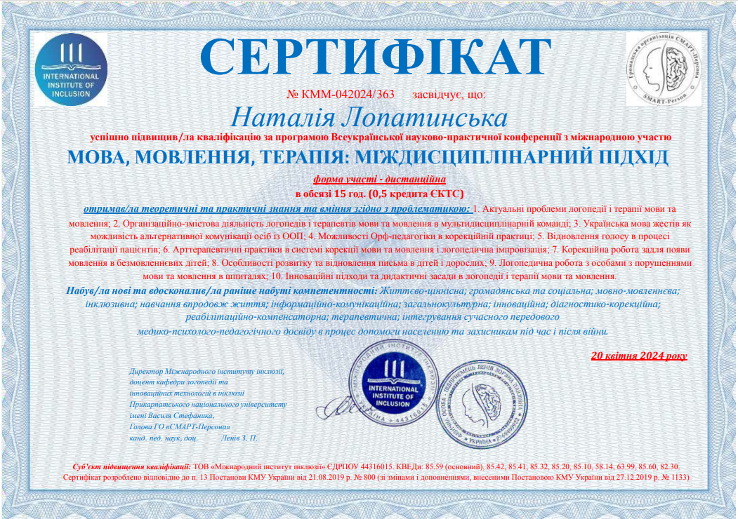 | 10613 | МОВА, МОВЛЕННЯ, ТЕРАПІЯ: МІЖДИСЦИПЛІНАРНИЙ ПІДХІД | участь | Івано-Франківськ |