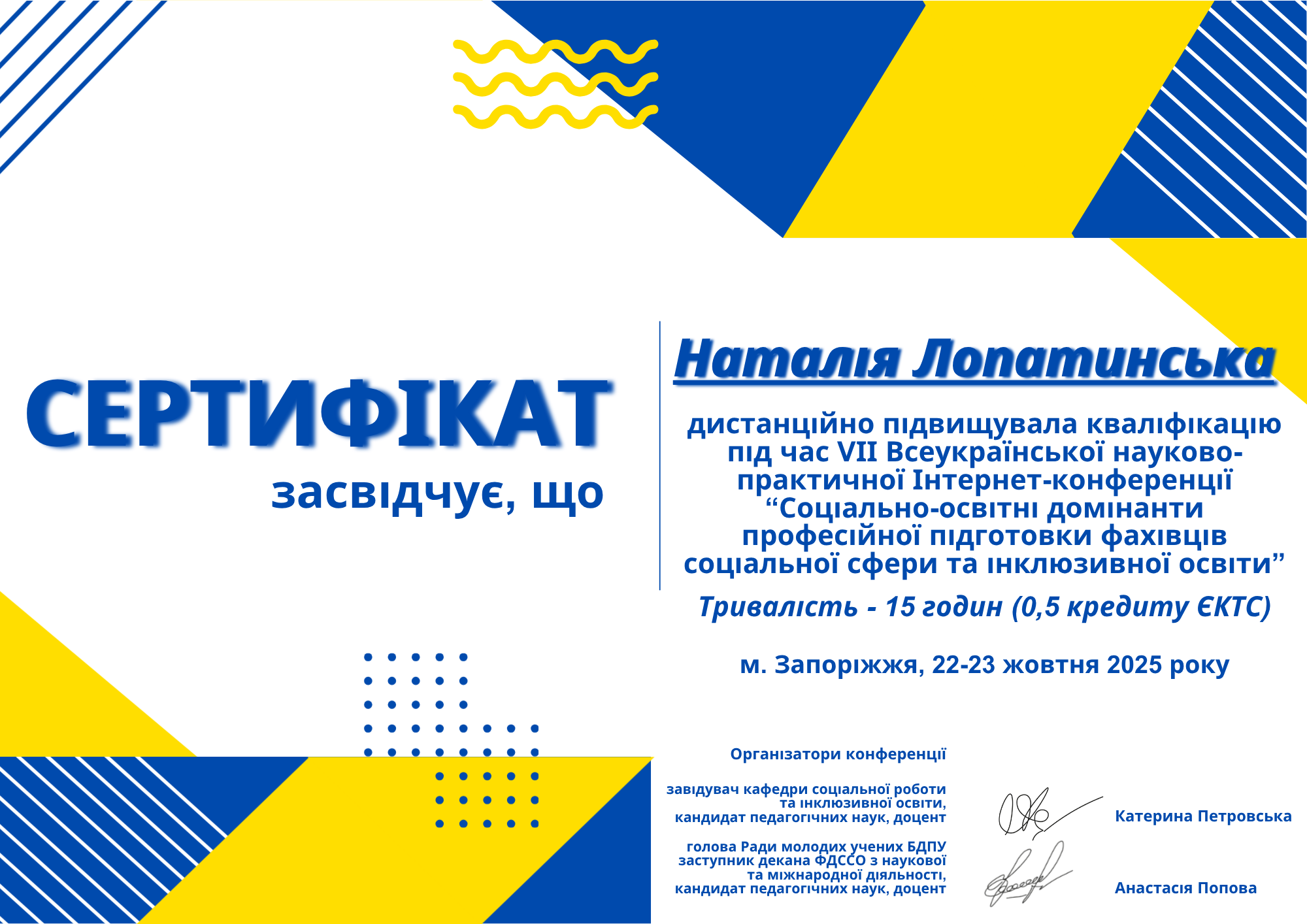 | ID | Назва | Тема доповіді | Місце проведення | Документ, що засвідчує | Дата проведення |