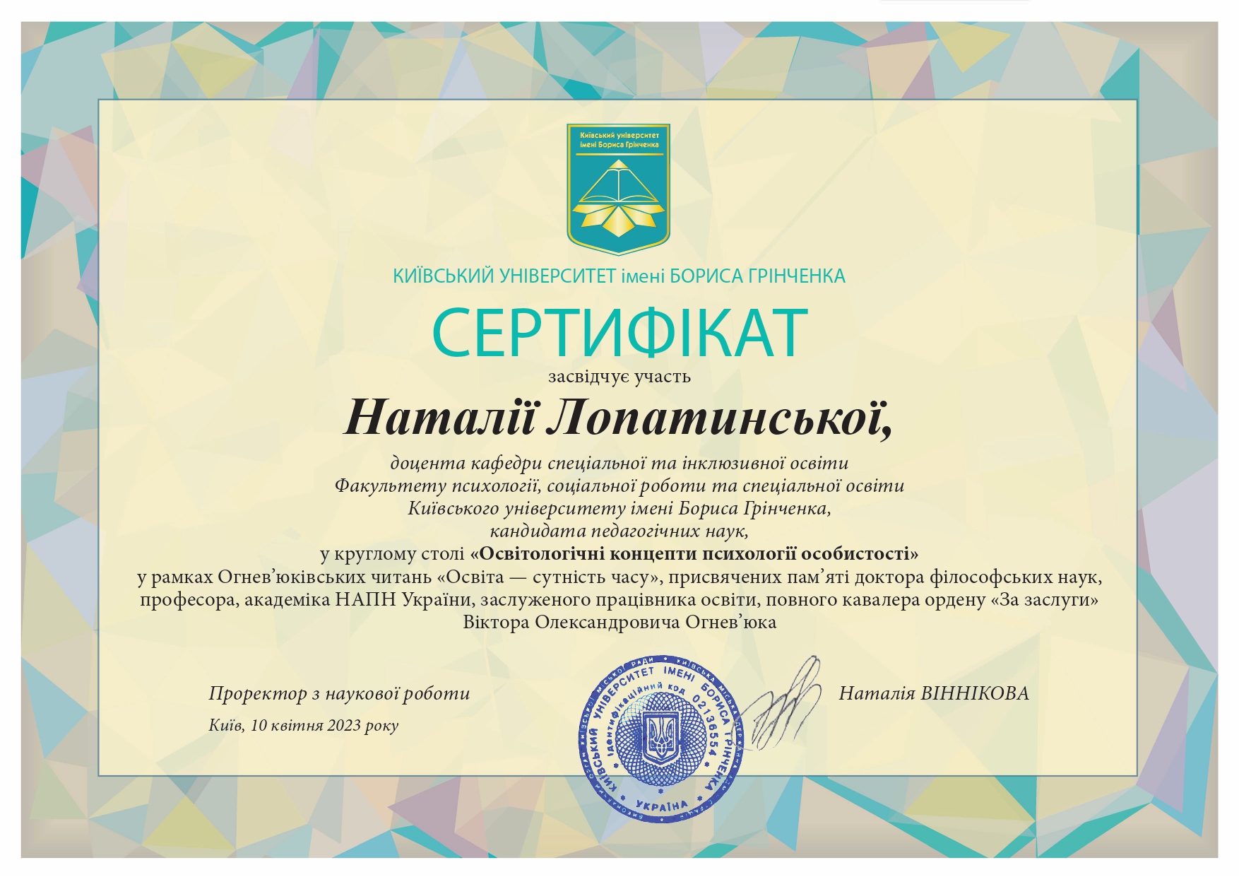 | 9589 | Огневʼюківські читання "Освіта - сутність часу" | участь у круглому столі "Освітологічні концепти психології особистості" | Київ |
