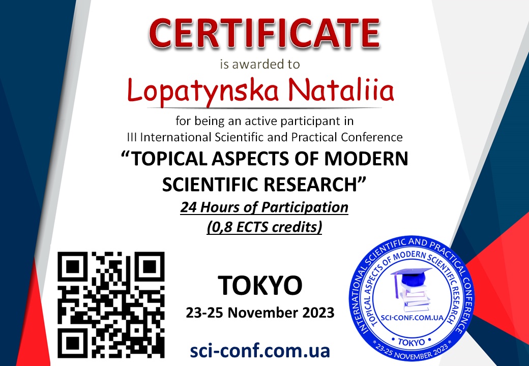 | 9751 | TOPICAL ASPECTS OF MODERN SCIENTIFIC RESEARCH | TELEGRAM-КАНАЛ ЯК ІНСТРУМЕНТ ІНФОРМАЦІЙНО-КОМП’ЮТЕРНОЇ ПІДТРИМКИ ЛОГОКОРЕКЦІЙНОГО ПРОЦЕСУ | Токіо, Японія |